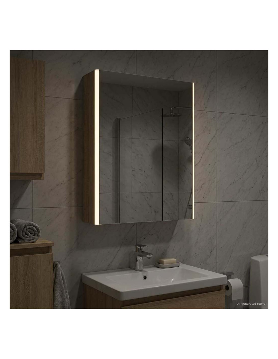 Questo armadietto a specchio per il bagno è una combinazione di design moderno e funzionalità pratica, essenziale per ogni bagno contemporaneo. La forma minimale e le linee chiare danno un tocco elegante, pur offrendo spazio per riporre gli oggetti di uso quotidiano. Include luci discrete che migliorano sia la visibilità che l'atmosfera, unendo utilità e stile in modo efficace. Costruzione in legno ingegnerizzato Questo armadietto è realizzato in legno ingegnerizzato resistente, che assicura durata e un aspetto raffinato. Questo materiale resiste bene all'umidità e alla deformazione, ideale per i bagni. Scaffalature versatili Gli scaffali in legno ingegnerizzato offrono soluzioni funzionali per vari articoli da toeletta. Grazie ai suoi ripiani regolabili, si adatta facilmente a oggetti di diverse dimensioni. Specchio doppio Con il suo specchio bidirezionale, combina riflesso e trasparenza. È ideale sia per le routine di bellezza sia per una maggiore privacy. Illuminazione LED regolabile Montato con luci LED a basso consumo, l'armadietto offre un'illuminazione personalizzata per ogni attività. Illumina bene gli spazi e si adatta facilmente all'arredamento. Installazione a parete sicura Progettato per un'installazione a parete, ottimizza lo spazio senza sacrificare la capacità di stoccaggio. Il sistema di montaggio è sicuro e insieme alle porte a cerniera assicura un facile accesso.