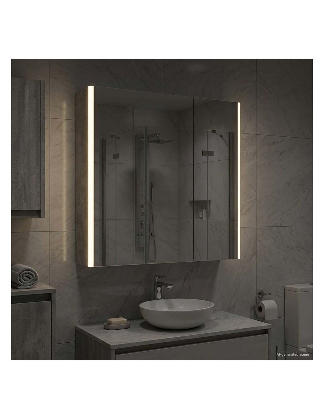 Questo armadietto a specchio per il bagno è una combinazione di design moderno e funzionalità pratica, essenziale per ogni bagno contemporaneo. La forma minimale e le linee chiare danno un tocco elegante, pur offrendo spazio per riporre gli oggetti di uso quotidiano. Include luci discrete che migliorano sia la visibilità che l'atmosfera, unendo utilità e stile in modo efficace. Costruzione in legno ingegnerizzato Questo armadietto è realizzato in legno ingegnerizzato resistente, che assicura durata e un aspetto raffinato. Questo materiale resiste bene all'umidità e alla deformazione, ideale per i bagni. Scaffalature versatili Gli scaffali in legno ingegnerizzato offrono soluzioni funzionali per vari articoli da toeletta. Grazie ai suoi ripiani regolabili, si adatta facilmente a oggetti di diverse dimensioni. Specchio doppio Con il suo specchio bidirezionale, combina riflesso e trasparenza. È ideale sia per le routine di bellezza sia per una maggiore privacy. Illuminazione LED regolabile Montato con luci LED a basso consumo, l'armadietto offre un'illuminazione personalizzata per ogni attività. Illumina bene gli spazi e si adatta facilmente all'arredamento. Installazione a parete sicura Progettato per un'installazione a parete, ottimizza lo spazio senza sacrificare la capacità di stoccaggio. Il sistema di montaggio è sicuro e insieme alle porte a cerniera assicura un facile accesso.