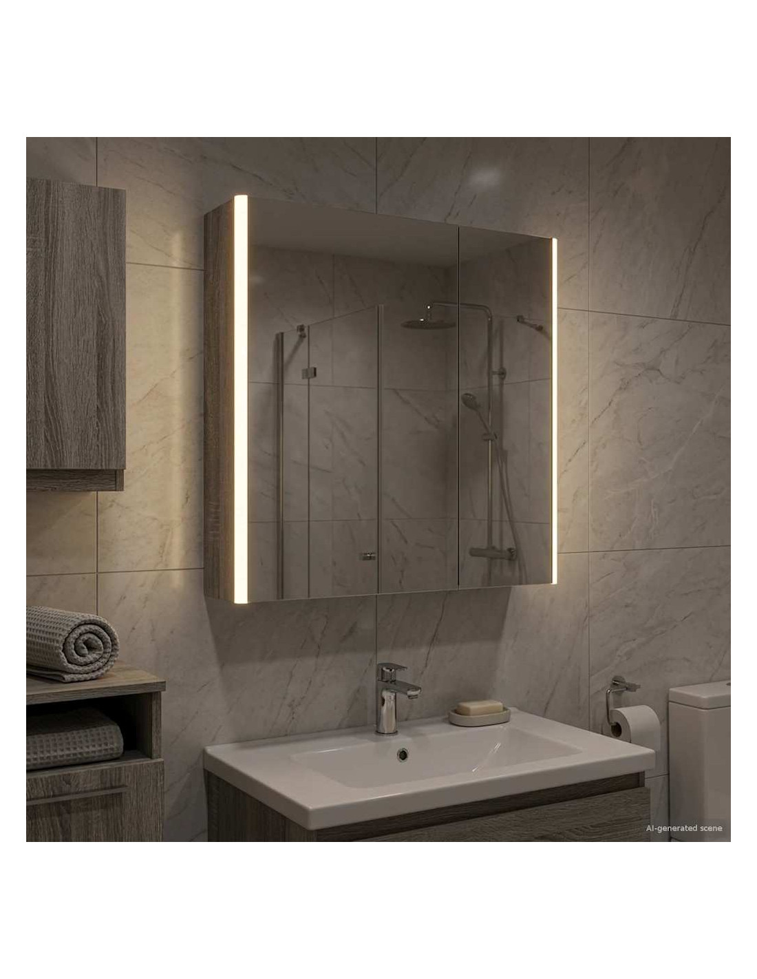 Questo armadietto a specchio per il bagno è una combinazione di design moderno e funzionalità pratica, essenziale per ogni bagno contemporaneo. La forma minimale e le linee chiare danno un tocco elegante, pur offrendo spazio per riporre gli oggetti di uso quotidiano. Include luci discrete che migliorano sia la visibilità che l'atmosfera, unendo utilità e stile in modo efficace. Costruzione in legno ingegnerizzato Questo armadietto è realizzato in legno ingegnerizzato resistente, che assicura durata e un aspetto raffinato. Questo materiale resiste bene all'umidità e alla deformazione, ideale per i bagni. Scaffalature versatili Gli scaffali in legno ingegnerizzato offrono soluzioni funzionali per vari articoli da toeletta. Grazie ai suoi ripiani regolabili, si adatta facilmente a oggetti di diverse dimensioni. Specchio doppio Con il suo specchio bidirezionale, combina riflesso e trasparenza. È ideale sia per le routine di bellezza sia per una maggiore privacy. Illuminazione LED regolabile Montato con luci LED a basso consumo, l'armadietto offre un'illuminazione personalizzata per ogni attività. Illumina bene gli spazi e si adatta facilmente all'arredamento. Installazione a parete sicura Progettato per un'installazione a parete, ottimizza lo spazio senza sacrificare la capacità di stoccaggio. Il sistema di montaggio è sicuro e insieme alle porte a cerniera assicura un facile accesso.