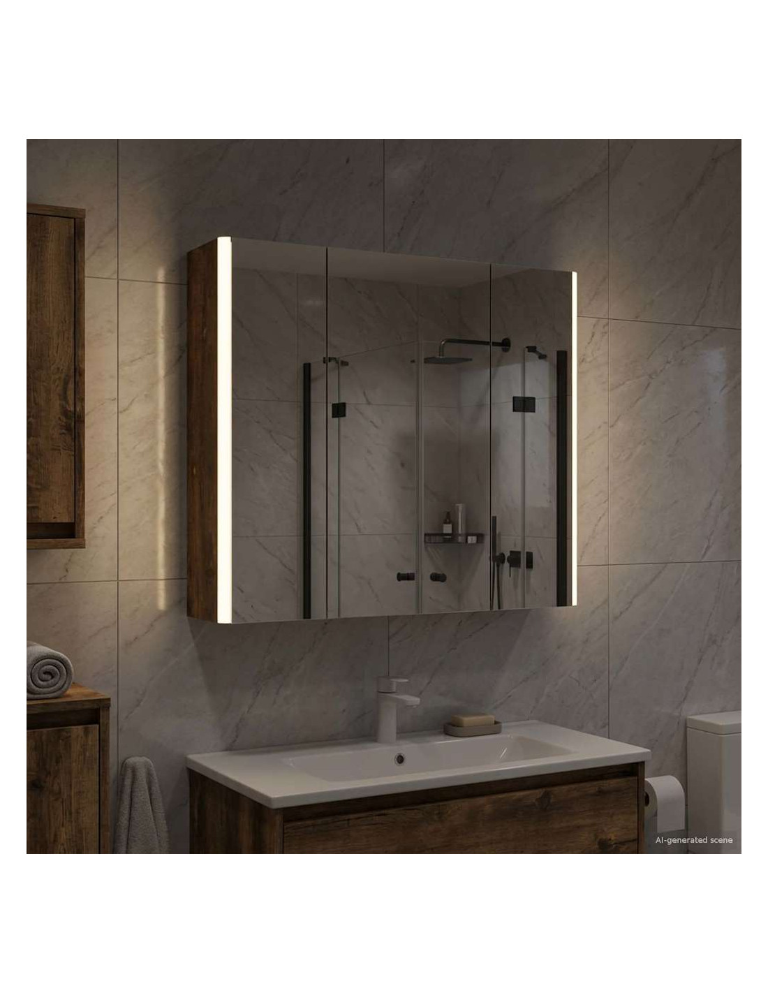 Questo armadietto a specchio per il bagno è una combinazione di design moderno e funzionalità pratica, essenziale per ogni bagno contemporaneo. La forma minimale e le linee chiare danno un tocco elegante, pur offrendo spazio per riporre gli oggetti di uso quotidiano. Include luci discrete che migliorano sia la visibilità che l'atmosfera, unendo utilità e stile in modo efficace. Costruzione in legno ingegnerizzato Questo armadietto è realizzato in legno ingegnerizzato resistente, che assicura durata e un aspetto raffinato. Questo materiale resiste bene all'umidità e alla deformazione, ideale per i bagni. Scaffalature versatili Gli scaffali in legno ingegnerizzato offrono soluzioni funzionali per vari articoli da toeletta. Grazie ai suoi ripiani regolabili, si adatta facilmente a oggetti di diverse dimensioni. Specchio doppio Con il suo specchio bidirezionale, combina riflesso e trasparenza. È ideale sia per le routine di bellezza sia per una maggiore privacy. Illuminazione LED regolabile Montato con luci LED a basso consumo, l'armadietto offre un'illuminazione personalizzata per ogni attività. Illumina bene gli spazi e si adatta facilmente all'arredamento. Installazione a parete sicura Progettato per un'installazione a parete, ottimizza lo spazio senza sacrificare la capacità di stoccaggio. Il sistema di montaggio è sicuro e insieme alle porte a cerniera assicura un facile accesso.