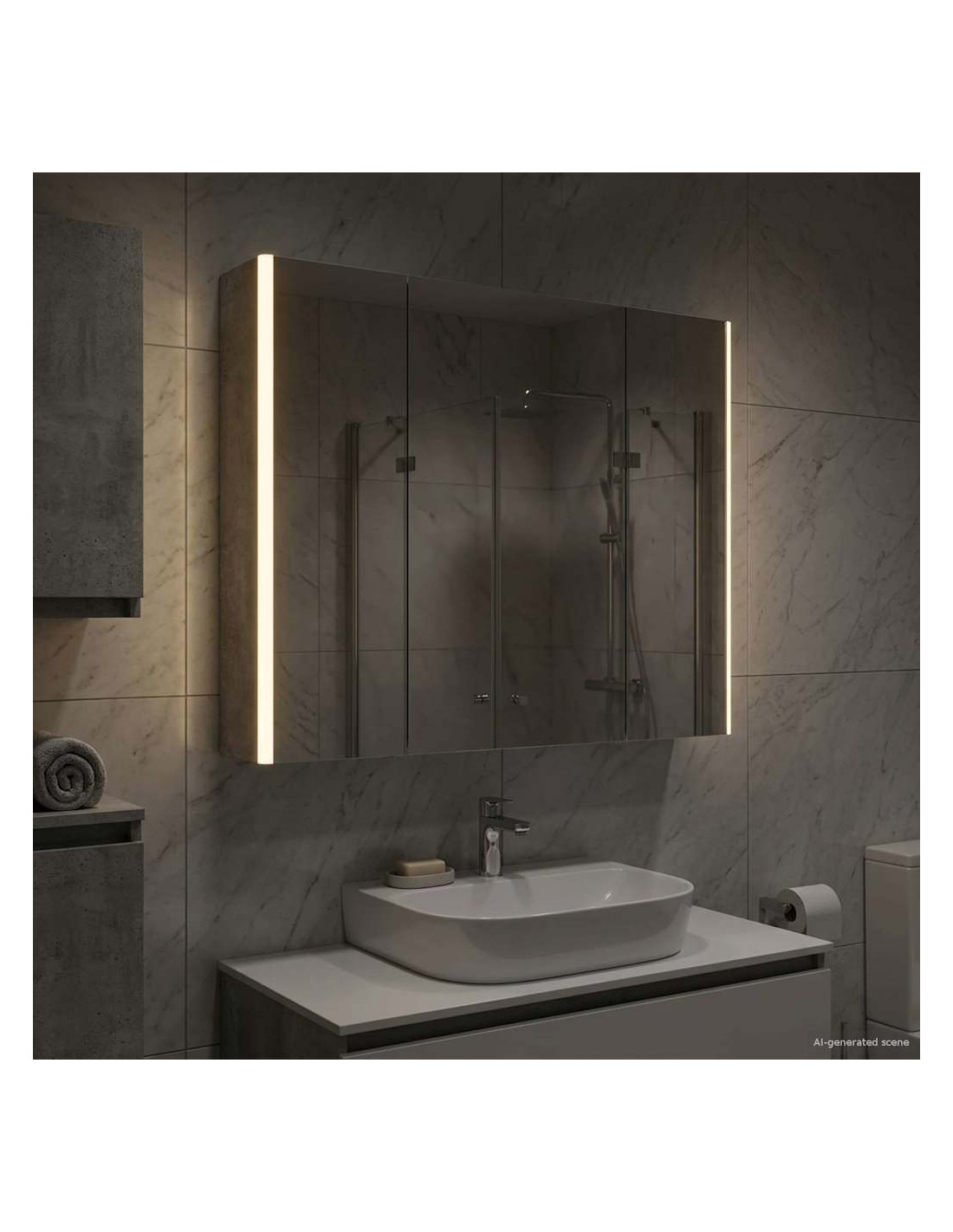 Questo armadietto a specchio per il bagno è una combinazione di design moderno e funzionalità pratica, essenziale per ogni bagno contemporaneo. La forma minimale e le linee chiare danno un tocco elegante, pur offrendo spazio per riporre gli oggetti di uso quotidiano. Include luci discrete che migliorano sia la visibilità che l'atmosfera, unendo utilità e stile in modo efficace. Costruzione in legno ingegnerizzato Questo armadietto è realizzato in legno ingegnerizzato resistente, che assicura durata e un aspetto raffinato. Questo materiale resiste bene all'umidità e alla deformazione, ideale per i bagni. Scaffalature versatili Gli scaffali in legno ingegnerizzato offrono soluzioni funzionali per vari articoli da toeletta. Grazie ai suoi ripiani regolabili, si adatta facilmente a oggetti di diverse dimensioni. Specchio doppio Con il suo specchio bidirezionale, combina riflesso e trasparenza. È ideale sia per le routine di bellezza sia per una maggiore privacy. Illuminazione LED regolabile Montato con luci LED a basso consumo, l'armadietto offre un'illuminazione personalizzata per ogni attività. Illumina bene gli spazi e si adatta facilmente all'arredamento. Installazione a parete sicura Progettato per un'installazione a parete, ottimizza lo spazio senza sacrificare la capacità di stoccaggio. Il sistema di montaggio è sicuro e insieme alle porte a cerniera assicura un facile accesso.