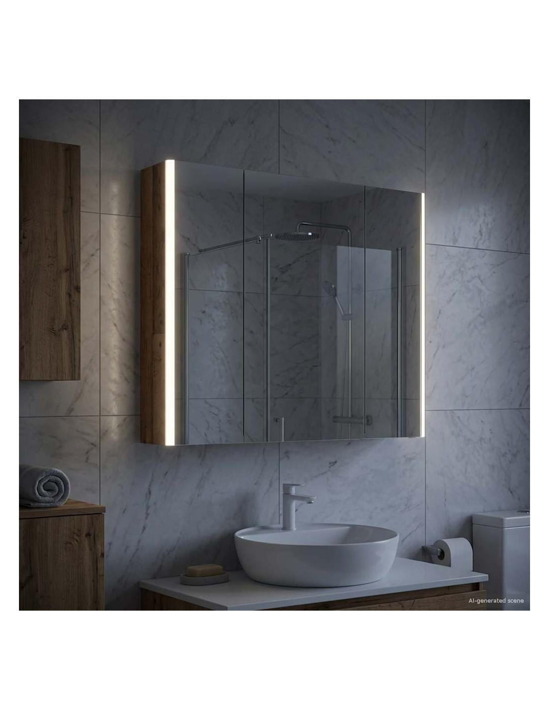 Questo armadietto a specchio per il bagno è una combinazione di design moderno e funzionalità pratica, essenziale per ogni bagno contemporaneo. La forma minimale e le linee chiare danno un tocco elegante, pur offrendo spazio per riporre gli oggetti di uso quotidiano. Include luci discrete che migliorano sia la visibilità che l'atmosfera, unendo utilità e stile in modo efficace. Costruzione in legno ingegnerizzato Questo armadietto è realizzato in legno ingegnerizzato resistente, che assicura durata e un aspetto raffinato. Questo materiale resiste bene all'umidità e alla deformazione, ideale per i bagni. Scaffalature versatili Gli scaffali in legno ingegnerizzato offrono soluzioni funzionali per vari articoli da toeletta. Grazie ai suoi ripiani regolabili, si adatta facilmente a oggetti di diverse dimensioni. Specchio doppio Con il suo specchio bidirezionale, combina riflesso e trasparenza. È ideale sia per le routine di bellezza sia per una maggiore privacy. Illuminazione LED regolabile Montato con luci LED a basso consumo, l'armadietto offre un'illuminazione personalizzata per ogni attività. Illumina bene gli spazi e si adatta facilmente all'arredamento. Installazione a parete sicura Progettato per un'installazione a parete, ottimizza lo spazio senza sacrificare la capacità di stoccaggio. Il sistema di montaggio è sicuro e insieme alle porte a cerniera assicura un facile accesso.