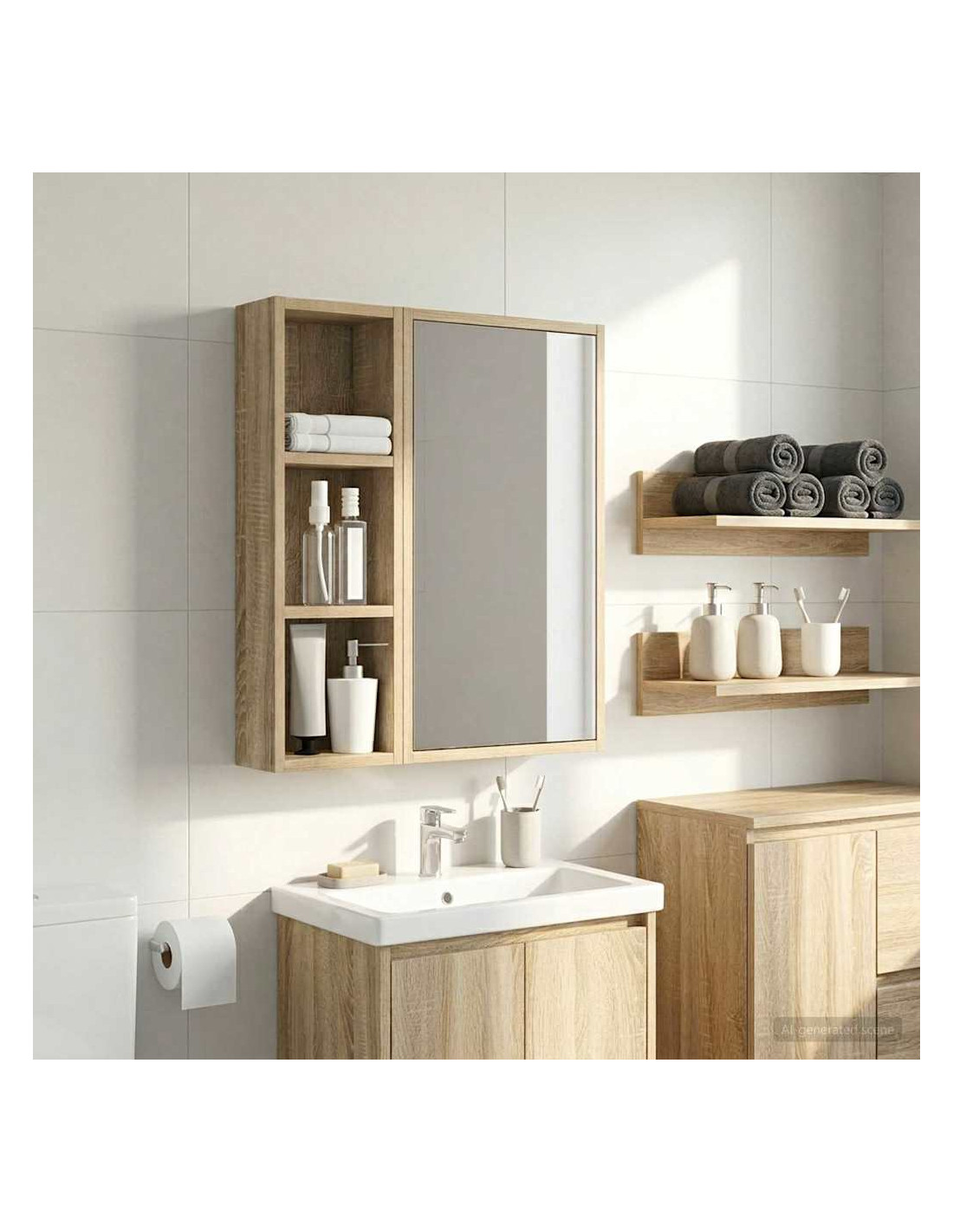Questo mobiletto bagno moderno è la soluzione ideale per chi cerca uno stoccaggio elegante e minimalista. Il design a muro è perfetto per bagni piccoli dove lo spazio è limitato, rendendolo un'ottima scelta per case moderne. Le linee pulite e la forma rettangolare migliorano ogni stile d'arredamento, fungendo da elemento pratico e bello da vedere. Materiali: Realizzato in legno ingegnerizzato, è robusto e resistente all'umidità, mantenendo un aspetto estetico gradevole e moderno. Componenti inclusi: Include ripiani pratici, perfetti per riporre vari articoli da bagno con facilità, tenendoli a portata di mano. Caratteristiche / Funzione / Design: Questo mobiletto a muro è studiato per ottimizzare lo spazio, aggiungendo ampie possibilità di stoccaggio senza ingombrare il pavimento. Usi consigliati: Ideale per bagni che necessitano di maggiore spazio di stoccaggio, perfetto per asciugamani, articoli da toeletta e altre necessità. Si inserisce bene in spazi compatti. Manutenzione: Pulisci le superfici con un panno umido e usa prodotti delicati per preservarne la qualità e il design nel tempo.