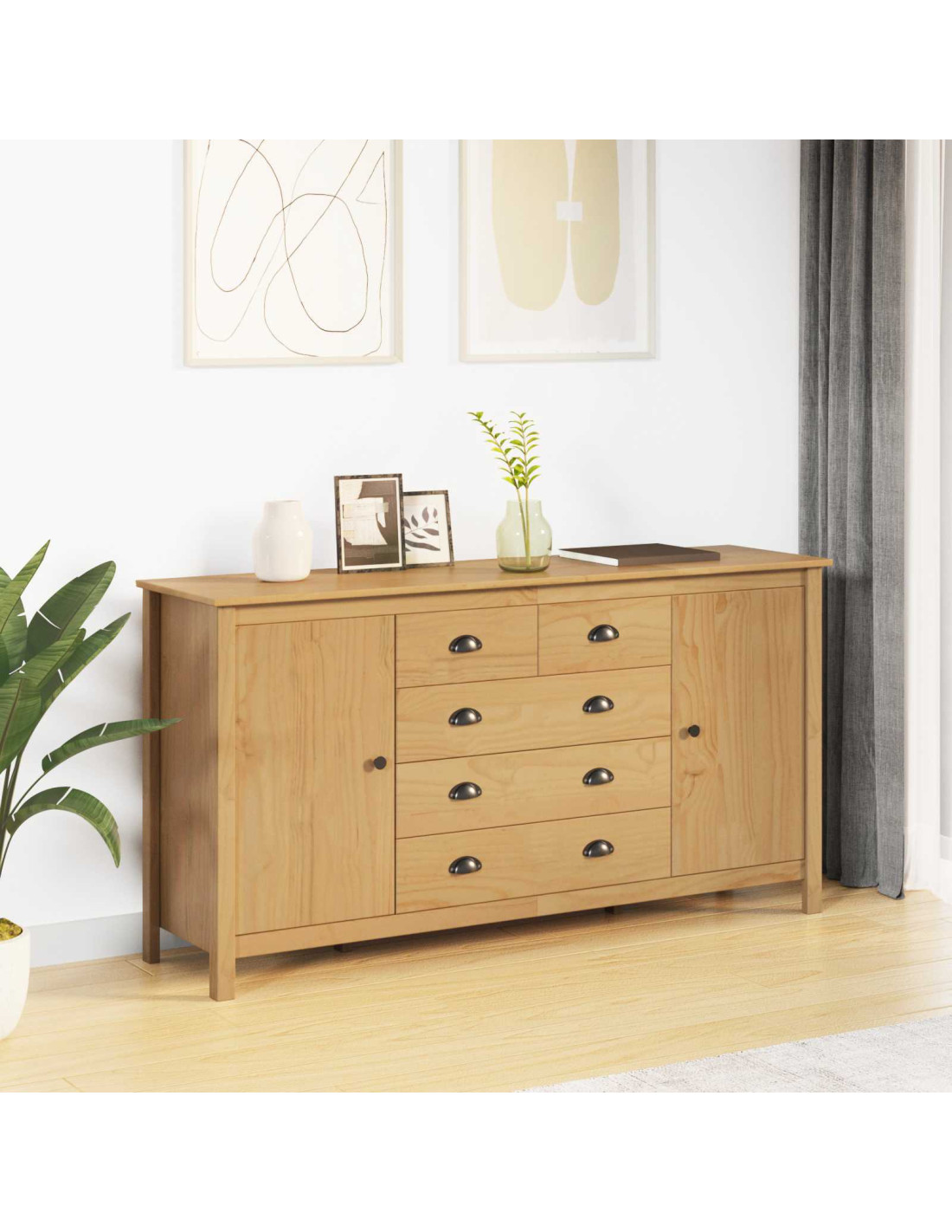 Questa credenza elegante unisce stile e praticità, diventando un pezzo indispensabile in ogni soggiorno. Realizzata in legno massello di pino, la sua tonalità marrone miele si adatta perfettamente a vari stili di arredamento, garantendo sia funzionalità che bellezza. Legno massello di pino di qualità: La credenza è fatta in legno massello di pino di alta qualità, che porta calore e un tocco elegante a ogni ambiente. È noto per la sua durabilità, offrendo una soluzione stabile per le tue necessità di stoccaggio, mantenendo sempre il suo fascino. Componenti di design pratico: Con porte a cerniera girevole a 90° e cassetti resistenti, la credenza permette un accesso facile agli oggetti riposti. Le maniglie a D facilitano l'apertura e la chiusura. I suoi design moderno e minimalista si adatta bene agli spazi contemporanei, unendo attrattiva estetica e funzionalità. Versatilità di stoccaggio: Questa credenza rettangolare è ideale per tenere in ordine il tuo spazio. Con ampie sezioni e cassetti, ripone facilmente tutto, da stoviglie a libri, rendendola un pezzo versatile sia in salotto che in sala da pranzo. Assemblaggio semplice: L'assemblaggio richiede due persone e strumenti base come un cacciavite e un martello. Le istruzioni semplificano il processo, assicurando un montaggio facile. Seguendo i passaggi, avrai un mobile robusto e affidabile. Cura e manutenzione: Per mantenere la sua finitura brillante, evita prodotti chimici forti durante la pulizia. Usa un panno asciutto per tenerla in perfetto stato. Una manutenzione regolare garantisce che rimanga bella e utile.