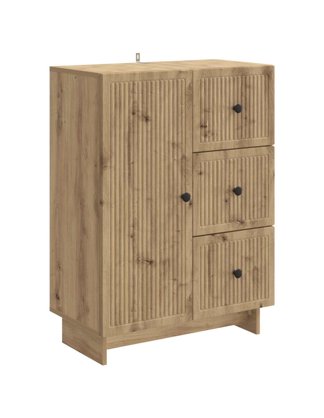 Questa credenza moderna è una soluzione di stoccaggio stylish per il tuo soggiorno o sala da pranzo e ha un sapore vintage. La sua forma rettangolare si adatta ovunque e aggiunge stile e funzionalità a qualsiasi ambiente. Progettata per accompagnare vari stili di arredamento, è versatile e elegante, perfetta per riporre oggetti per la cena o per mostrare decorazioni. Aggiungila alla tua casa per un tocco chic e pratico. Materiale in legno ingegnerizzato: Questa credenza è realizzata in legno ingegnerizzato, un materiale robusto e sicuro. Ha un aspetto fresco e moderno, ed è resistente all'usura quotidiana. Scegliendo questo materiale, hai la certezza di avere un mobile che durerà nel tempo. Manopole in metallo: Con le manopole in metallo sui cassetti e sulle porte, è facile aprirli. Queste manopole non sono solo belle, ma ti aiutano anche a prendere gli oggetti senza sforzo. La loro eleganza si sposa bene con lo stile vintage generale. Porte a cerniera girevole a 90°: Le porte girevoli a 90° permettono un accesso diretto all'interno. Questo design porta un tocco retro e risulta molto pratico. Che tu stia prendendo qualcosa per la cena o sistemando il soggiorno, queste porte rendono tutto più semplice. Configurazione dei ripiani: Dentro la credenza ci sono ripiani utili che ottimizzano lo spazio per i tuoi oggetti. Che tu voglia impilare piatti o esporre decorazioni, ci sarà sempre spazio a sufficienza. Manutenzione e montaggio: Per mantenerla basta un panno umido. Include anche un attacco a muro per la sicurezza. Per montarla servono due persone, un cacciavite e una chiave inglese, così è tutto ben fissato.