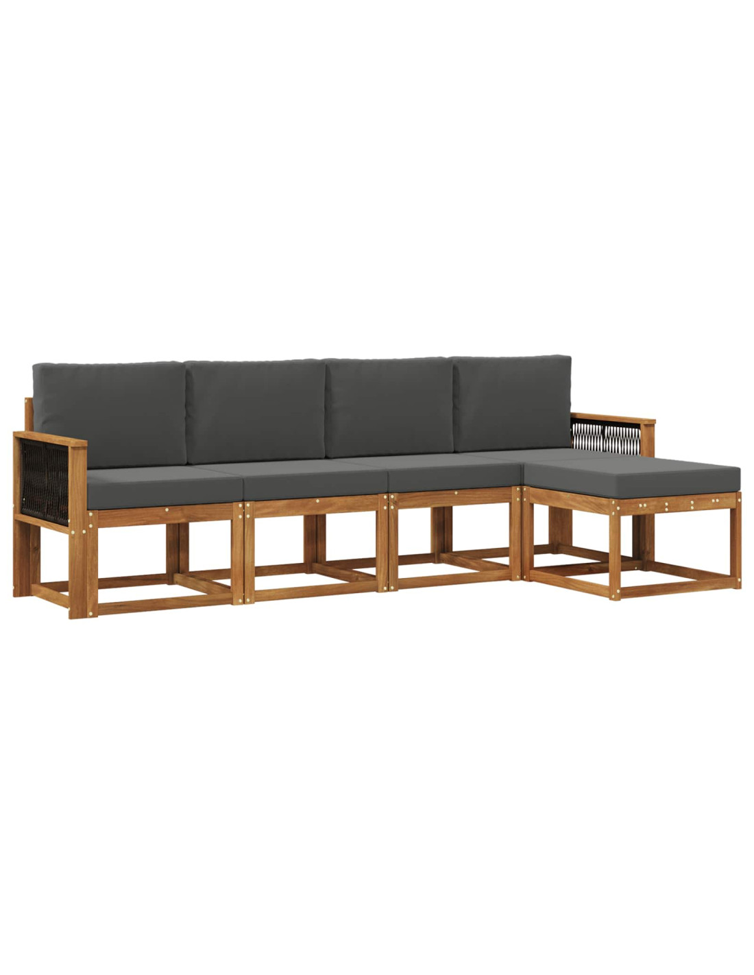 Questo set di divani sezionali da esterno è progettato per combinare stile e funzionalità, perfetto per giardini e terrazze moderni. Con linee eleganti e un design minimalista, è un'aggiunta raffinata che crea uno spazio lounge invitante per socializzare o rilassarsi. Il suo aspetto sofisticato è supportato da una costruzione solida, in grado di resistere alle intemperie, rendendolo versatile per ogni ambiente esterno contemporaneo. Materiali: Ogni pezzo è fatto in legno massello di acacia robusto, rinomato per la sua resistenza e durevolezza, che richiede poca manutenzione. La grana fine e il colore caldo del legno aggiungono un tocco lussuoso a qualsiasi spazio esterno. Componenti Inclusi: Braccioli, schienale e seduta sono realizzati in legno massello di acacia, con una colorazione marrone uniforme che offre un aspetto coeso e confortevole. Il design a doghe favorisce il drenaggio dell'acqua e arricchisce il look. Caratteristiche/ Funzione/ Design: Il design a doghe migliora la circolazione dell'aria, garantendo comfort anche nei giorni più caldi. La sua funzionalità si adatta ai vari arrangiamenti, aumentando la flessibilità del tuo spazio esterno con facilità. Usi Consigliati: Creato per l'uso all'aperto, questo set di divani è perfetto per giardini, terrazze e spazi lounge all'aperto. È ideale per feste o per momenti di relax con amici e famigliari, adattandosi bene a diversi stili di arredo esterno. Manutenzione e Cura: L'assemblaggio richiede due persone e un cacciavite, seguendo le istruzioni per una corretta messa in sicurezza. Per mantenerlo in ottimo stato, pulisci con un panno asciutto e coprilo durante i temporali.