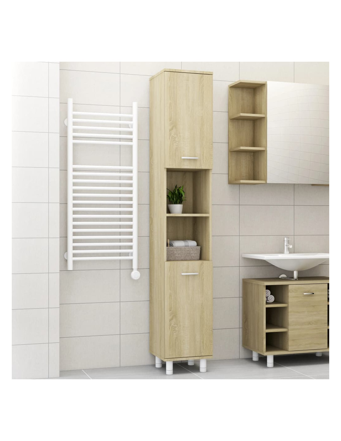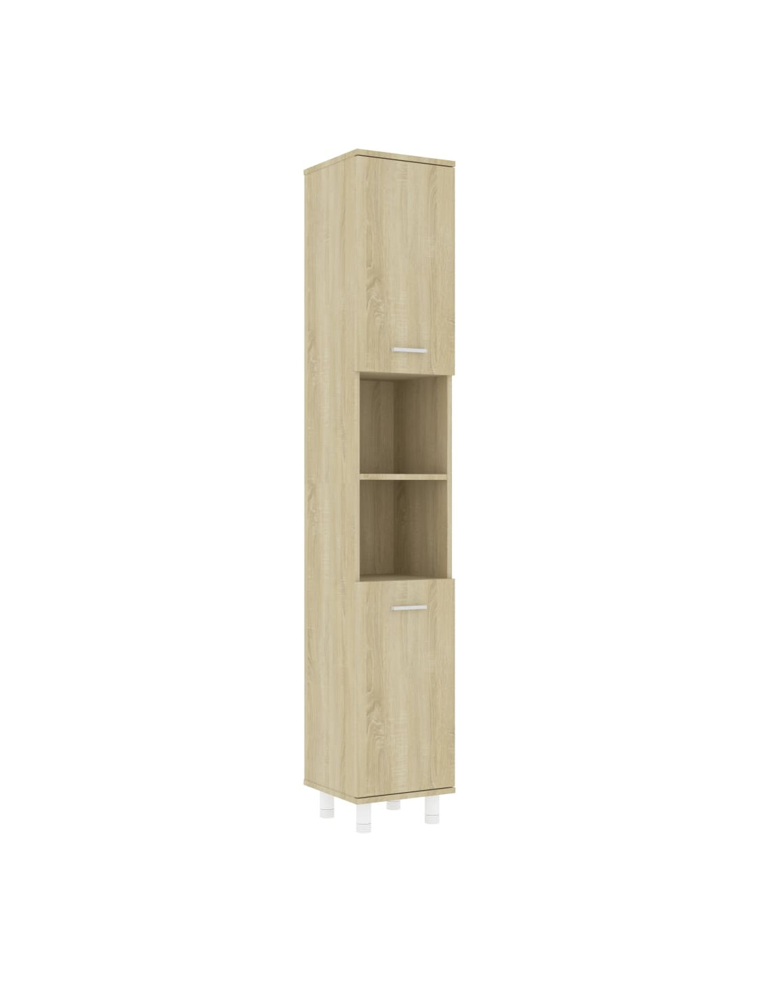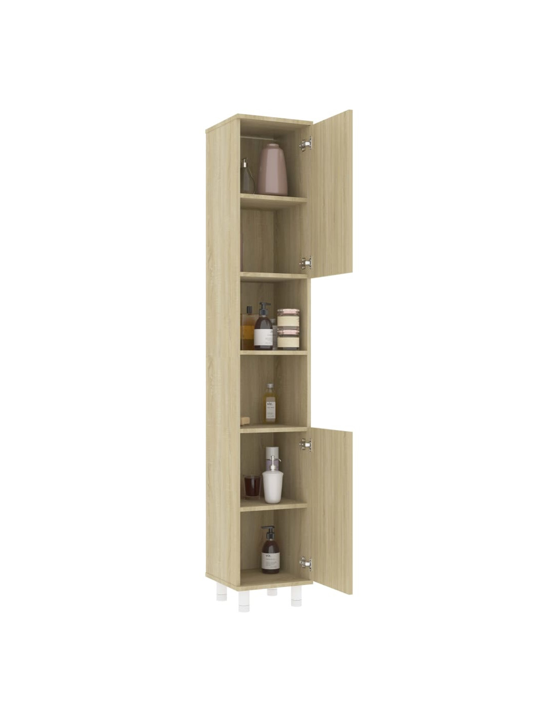 Questo mobile elegante è realizzato in legno multistrato, essendo robusto e stabile. Lo scaffale per la lavanderia dispone di 6 scomparti e 2 ante, offrendo ampie opzioni di conservazione per riporre gli oggetti nel vostro bagno. Su ciascuna anta è presente una maniglia per facilitare l'apertura e la chiusura. Il mobile è facile da pulire con un panno umido.