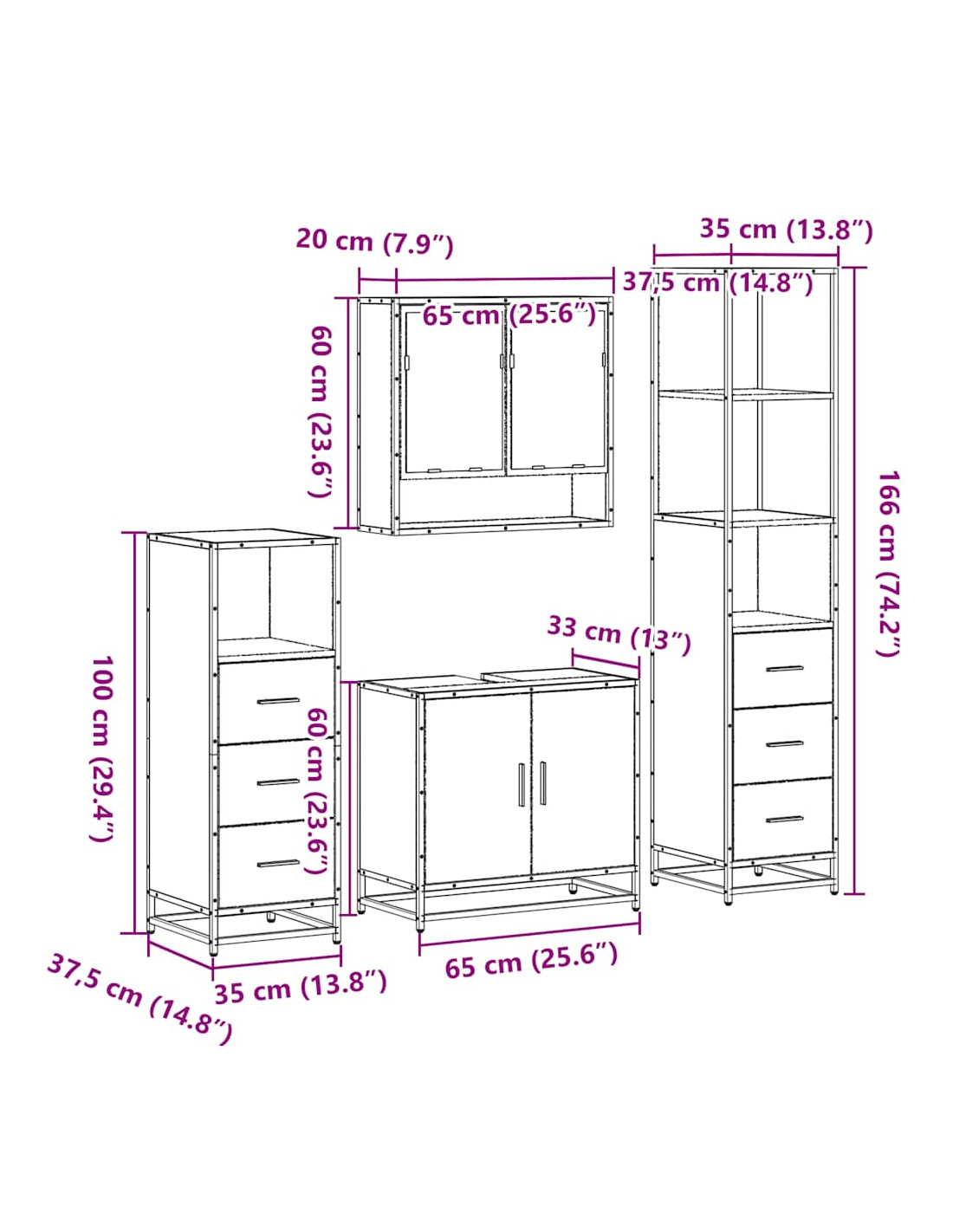 • Dimensioni del mobile da bagno (basso): 35 x 37,5 x 100 cm (L x P x A)