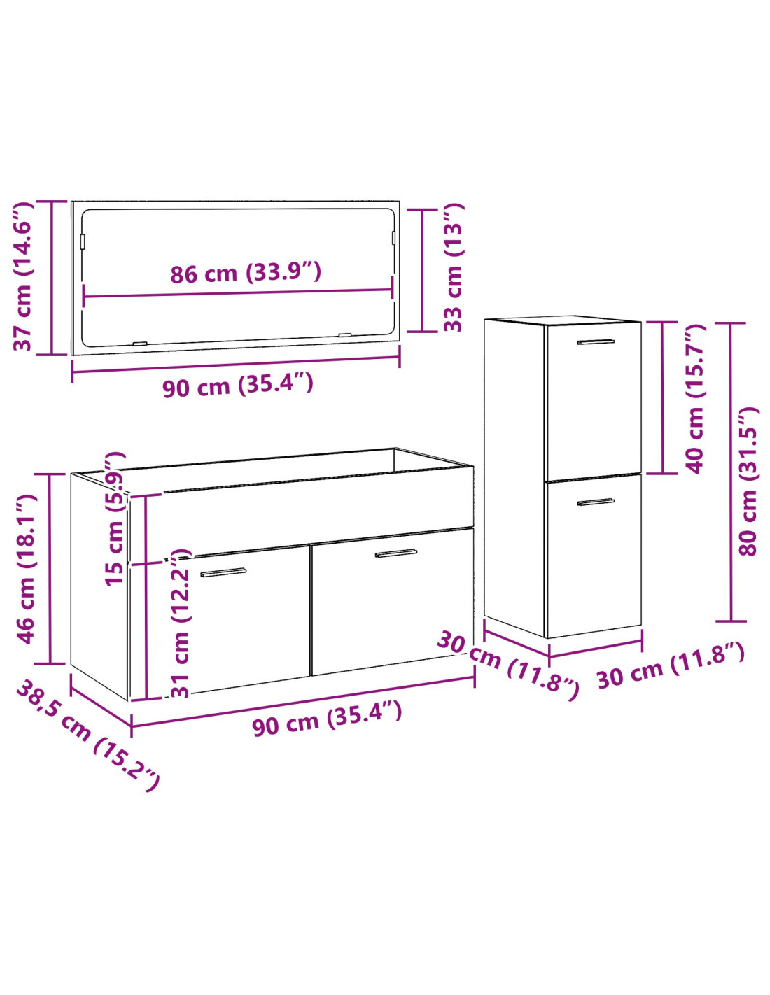 - Materiali: Questo set di mobili per bagno è fatto in legno ingegnerizzato di alta qualità, offre una costruzione robusta per uso interno. È scelto per la sua resistenza e il suo aspetto duraturo, assicurando che il tuo set mantenga eleganza e solidità anche con l'uso quotidiano.