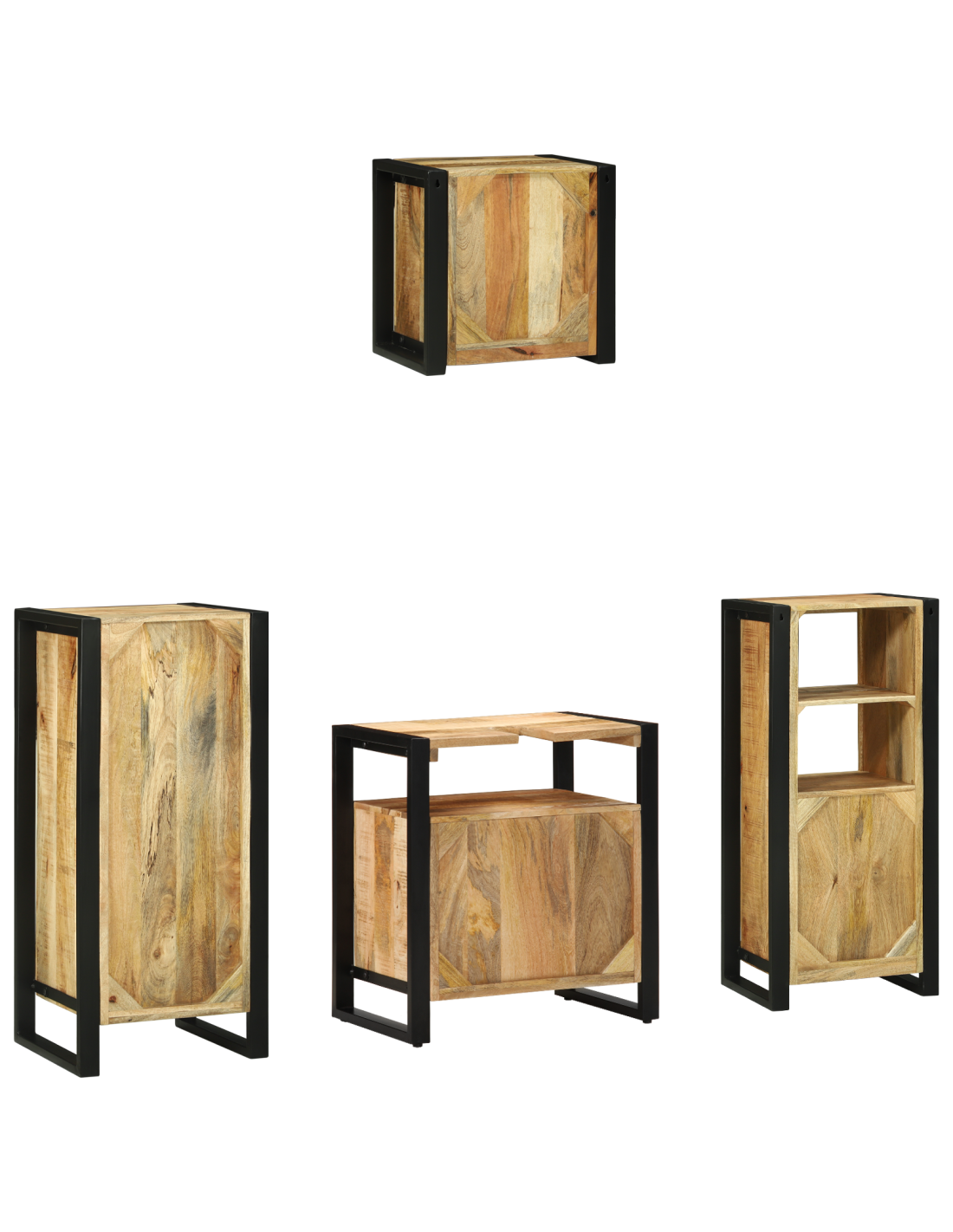 - Componenti Inclusi: Il set comprende vari elementi da stoccaggio, inclusi armadietti con porte in legno massello. Questi sono montati a parete, ideali per chi vuole risparmiare spazio mantenendo un look elegante.