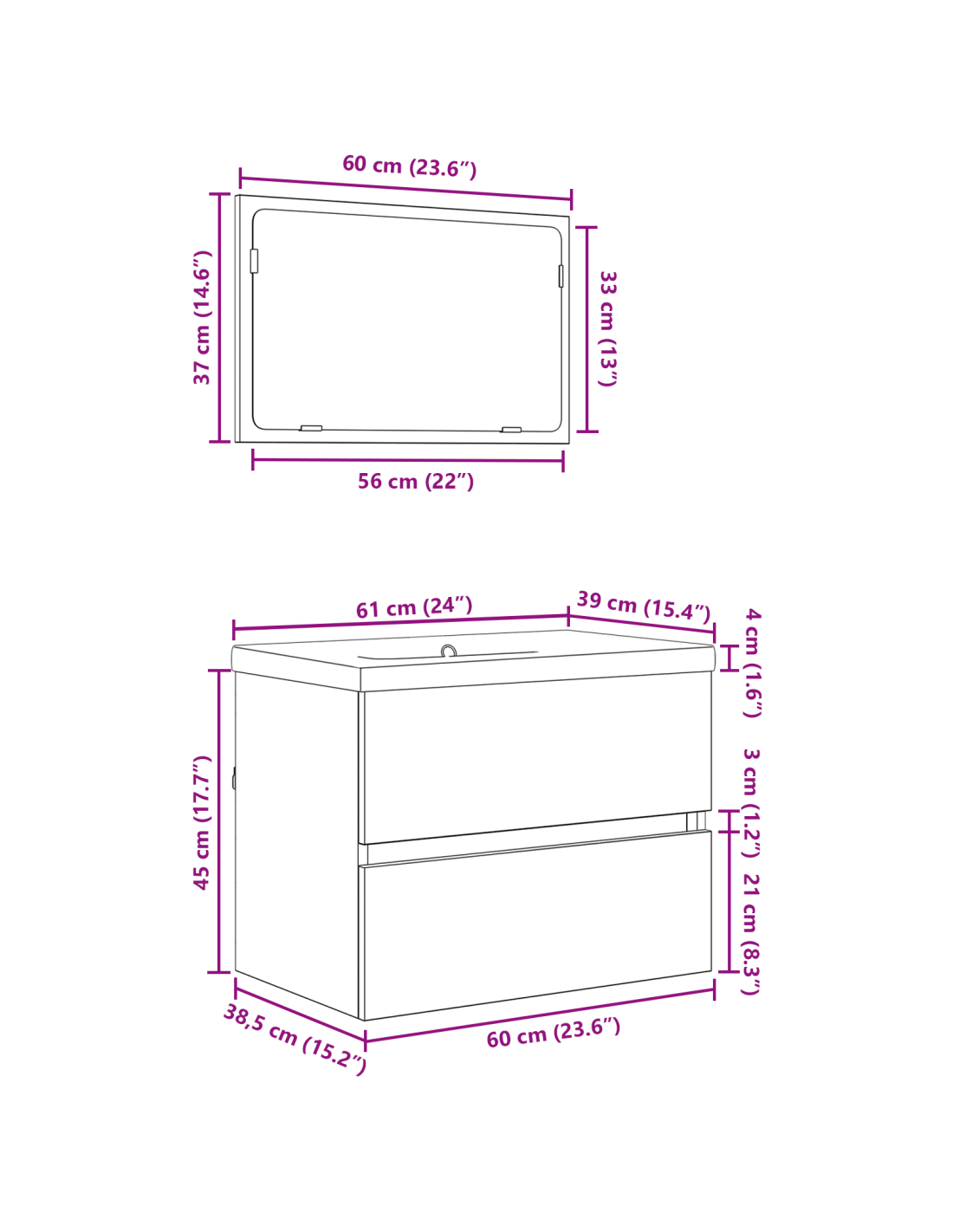- 1 x Mobile lavabo: 60 x 38.5 x 45 cm (LxWxH)