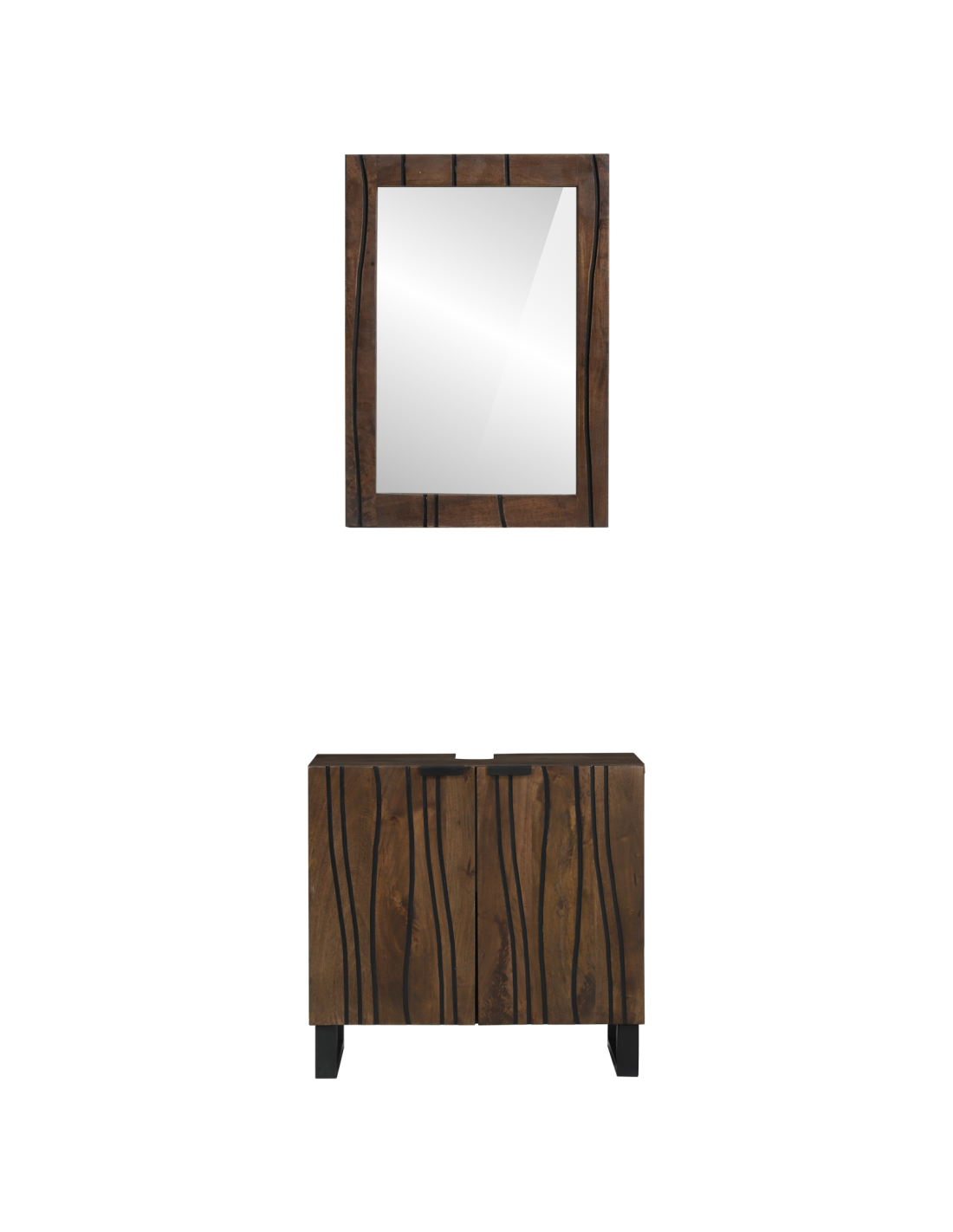 - Componenti inclusi: Il set include uno specchio piano moderno di 50 x 70 cm, che offre una riflessione chiara, perfetta per la cura personale. Il mobile lavabo, con le sue dimensioni di 62 x 33 x 58 cm, ha porte a filo e ripiani, fornendo tanto spazio per vari oggetti del bagno, il tutto sostenuto da robuste gambe in metallo nero.