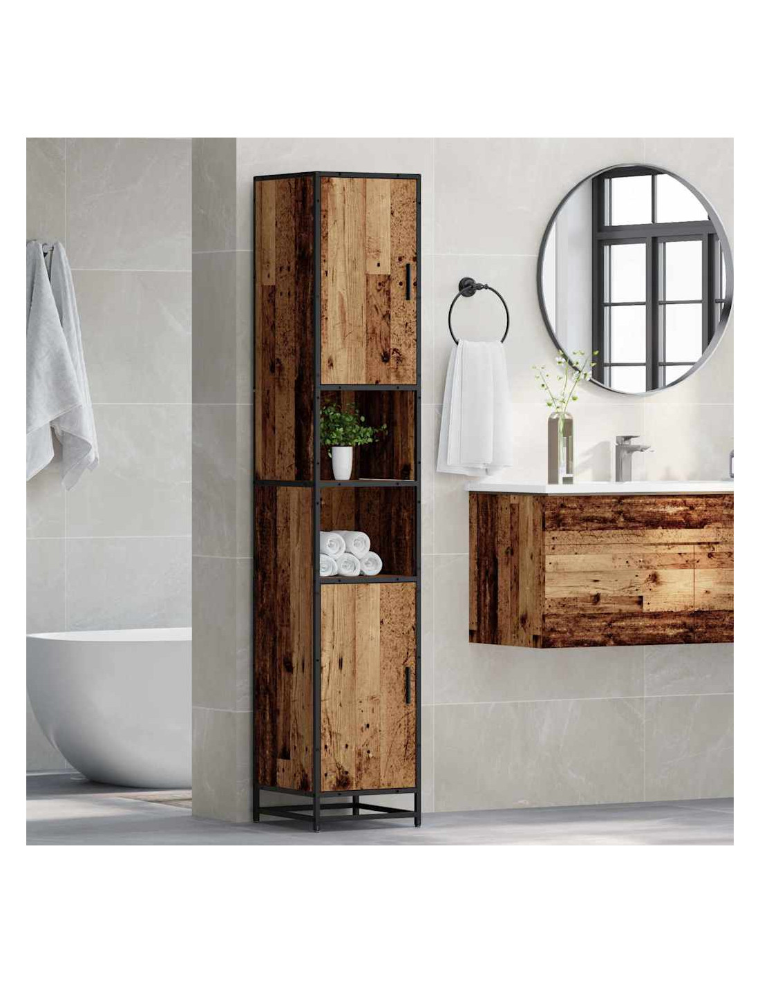 - Componenti inclusi: Il set comprende un armadio da bagno con una struttura a gamba, supporti per ripiani in legno ingegnerizzato e porte a filo con maniglie in metallo. Questi elementi creano un aspetto armonioso e pratico, facilitando l'organizzazione di prodotti per la cura personale e asciugamani. Le maniglie dal design semplice aggiungono un tocco chic senza sforzo.