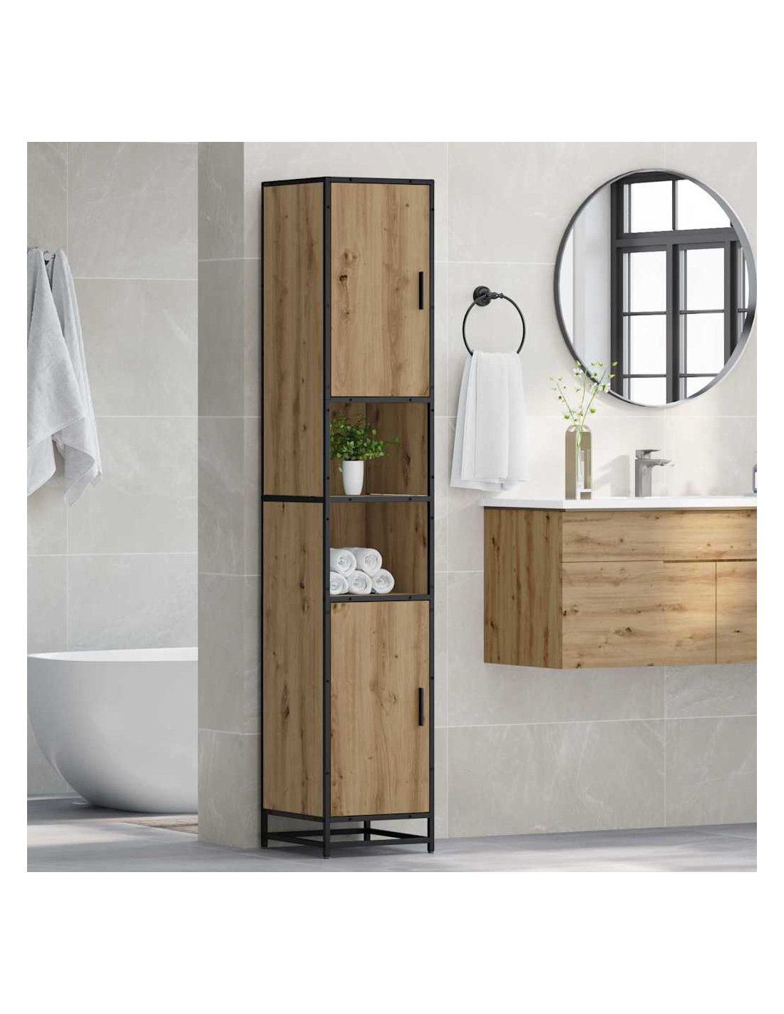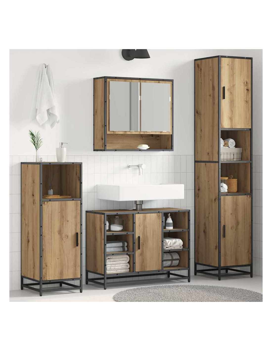 Questo set di mobili per bagno moderno cambia il modo di organizzare il tuo spazio, portando un tocco contemporaneo con le sue linee eleganti. Creato per soddisfare le esigenze delle famiglie di oggi, trasforma il tuo bagno in un ambiente ordinato, perfetto per gli oggetti di uso quotidiano. Progettato specificamente per interni, questa collezione è all'insegna della semplicità e funzionalità, con forme minimali al centro del design moderno. Tutto ha il suo posto, creando un'atmosfera di ordine e tranquillità senza rinunciare allo stile. Materiali: Fatto in legno ingegnerizzato di alta qualità, il set è resistente e duraturo. Questo materiale è ideale per l'uso in bagni umidi, grazie alla sua resistenza all'usura. Le superfici lisce danno un aspetto moderno e snello a tutta la collezione. Componenti inclusi: Il set comprende un armadio da bagno con una struttura a gamba, supporti per ripiani in legno ingegnerizzato e porte a filo con maniglie in metallo. Questi elementi creano un aspetto armonioso e pratico, facilitando l'organizzazione di prodotti per la cura personale e asciugamani. Le maniglie dal design semplice aggiungono un tocco chic senza sforzo. Caratteristiche / Funzione / Design: Grazie alla sua grande capacità di stoccaggio, questo set soddisfa le esigenze di famiglie diverse. Le porte a filo offrono una superficie continua, enfatizzando il design moderno. È progettato per durare, promettendo resistenza all'uso quotidiano. Usi raccomandati: Perfetto per il bagno, questo set aiuta a tenere tutto in ordine. Dai ripiani spaziosi ai compartimenti ben distribuiti, ogni pezzo serve a uno scopo, assicurando che prodotti per la pulizia e biancheria siano a portata di mano e sistemati correttamente. Manutenzione: Mantieni il tuo mobile pulito passando un panno umido. Evita sostanze chimiche aggressive che possono rovinare la finitura del legno. Seguendo queste semplici indicazioni, garantirai che il set mantenga il suo aspetto e la sua funzionalità per anni a venire.
