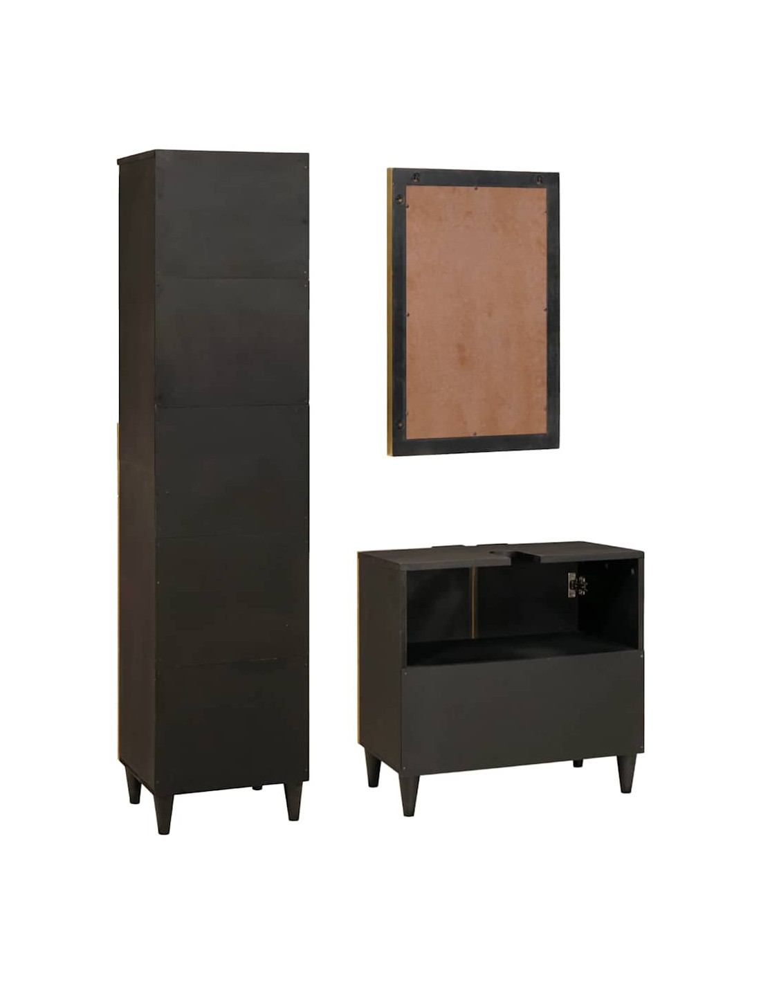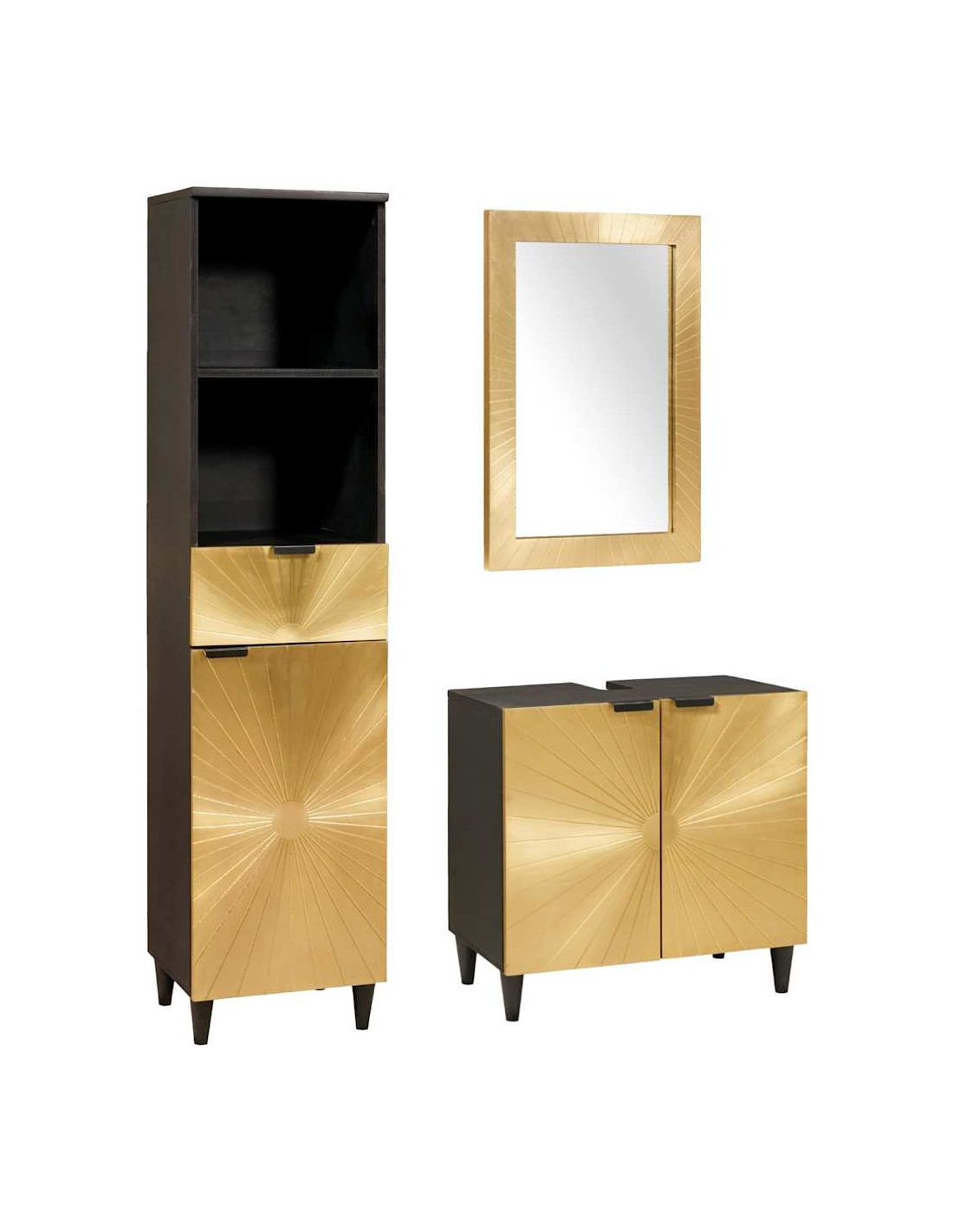Questo Set di Mobili per Bagno Moderno è una soluzione elegante e pratica per i bagni moderni. L'abbinamento di nero e oro aggiunge un tocco di eleganza a qualsiasi ambiente, e offre tante opzioni di stoccaggio con cassetti, ripiani e porte a specchio per aiutarti a rimanere organizzato. Costruito con materiali resistenti, questo set non solo è bello, ma resiste anche all'umidità del bagno e all'uso quotidiano. È ideale per chi cerca un mix di bellezza e praticità nella propria casa.