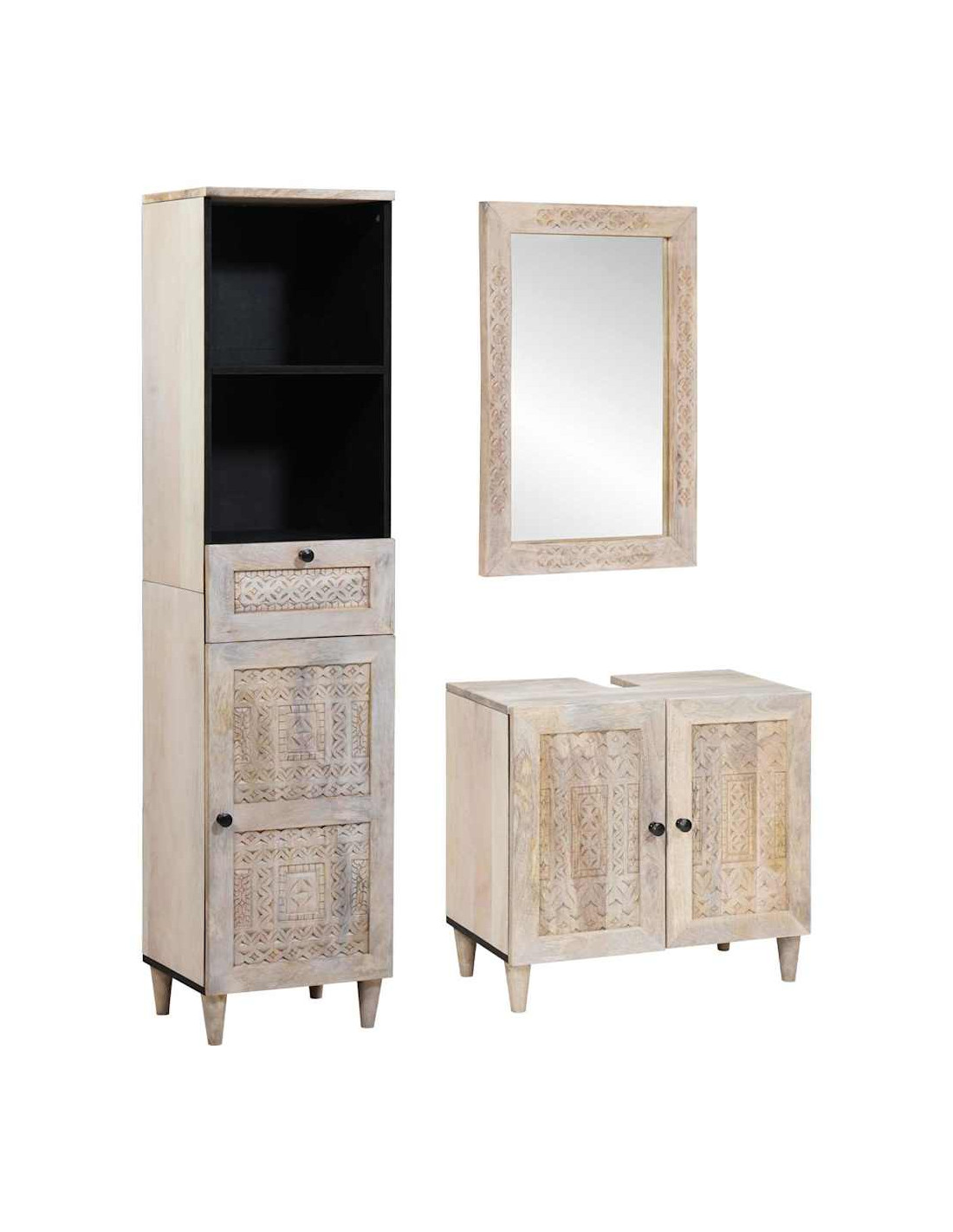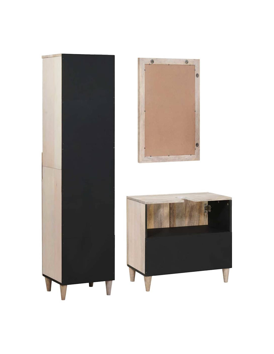 Questo set di mobili in legno è pensato per portare un po'di eleganza rustica in qualsiasi bagno. Combina stile e praticità con un mobile lavabo, un armadietto e uno specchio—tutti progettati per integrarsi perfettamente con la decorazione del tuo bagno, offrendo soluzioni di stoccaggio intelligenti. Il legno massello di mango gli regala una sensazione solida e naturale, creando un'atmosfera accogliente che piacerà a tutti. Le finiture in legno naturale mostrano il suo stile rustico, adattandosi a diversi design d'interni.