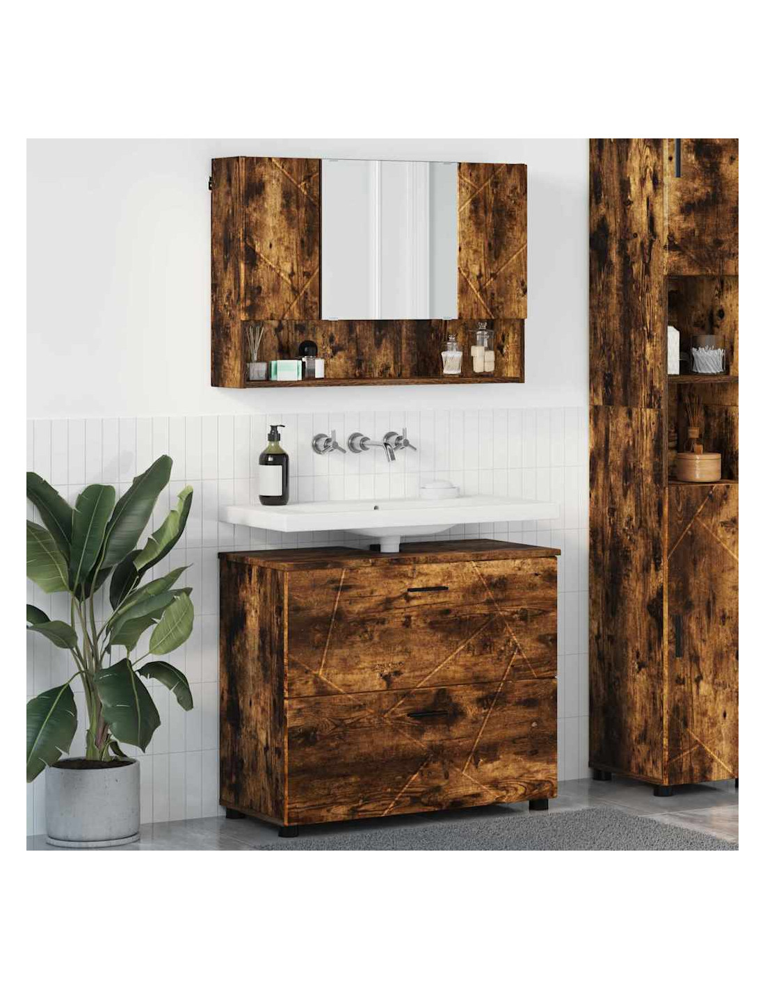 Il Set di Mobili da Bagno in Legno Ingegnerizzato combina perfettamente stile moderno e design pratico. Con linee pulite e un aspetto liscio, questo set migliora l'atmosfera del tuo bagno, fornendo soluzioni di stoccaggio solide. È perfetto per chi ama la semplicità e l'uso intelligente dello spazio, con un look elegante e una robusta struttura in legno ingegnerizzato, ideale per la vita in città. L'atmosfera chic e minimalista del set porta calma al bagno. Con funzionalità come mobili specchiera e ampi scaffali, soddisfa tutti i requisiti per riporre articoli da toeletta, asciugamani e altri oggetti essenziali.