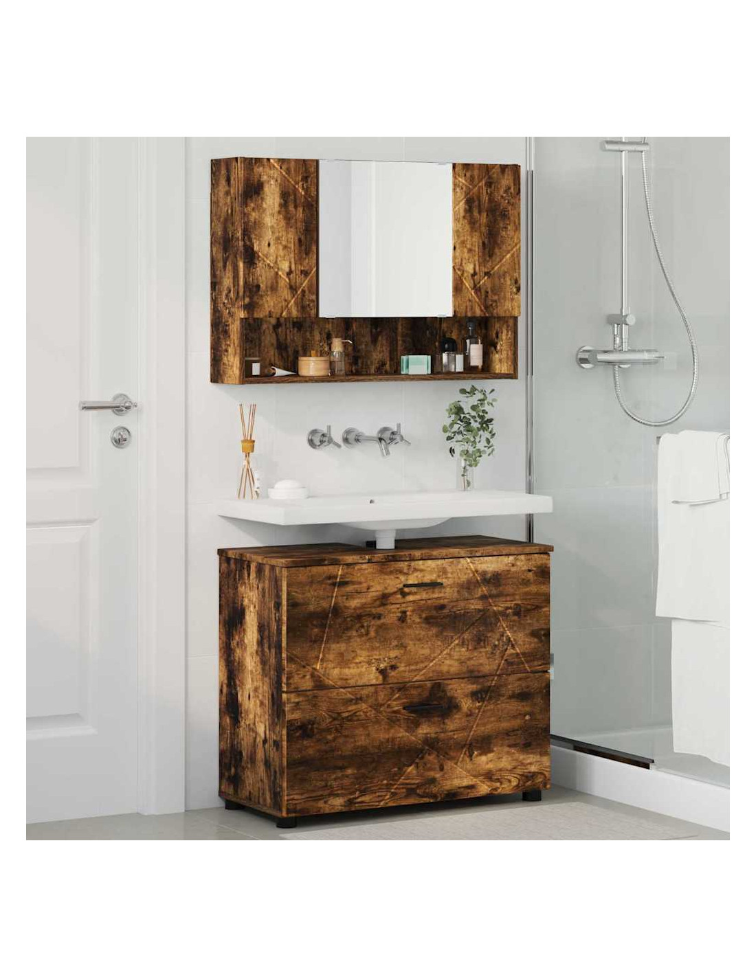 - Componenti Inclusi: Il set include un mobile lavabo progettato con cura e un mobile specchiera abbinato. Lo specchio è perfetto per la cura personale e per far entrare luce naturale. Le porte a cerniera e i meccanismi dei cassetti lisci sono pratici e ti danno accesso facile alle tue cose.