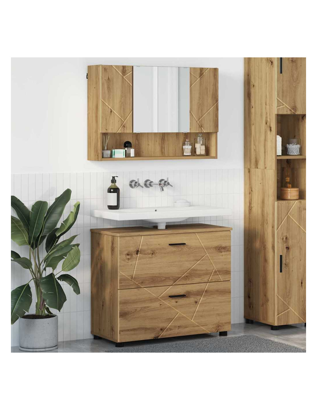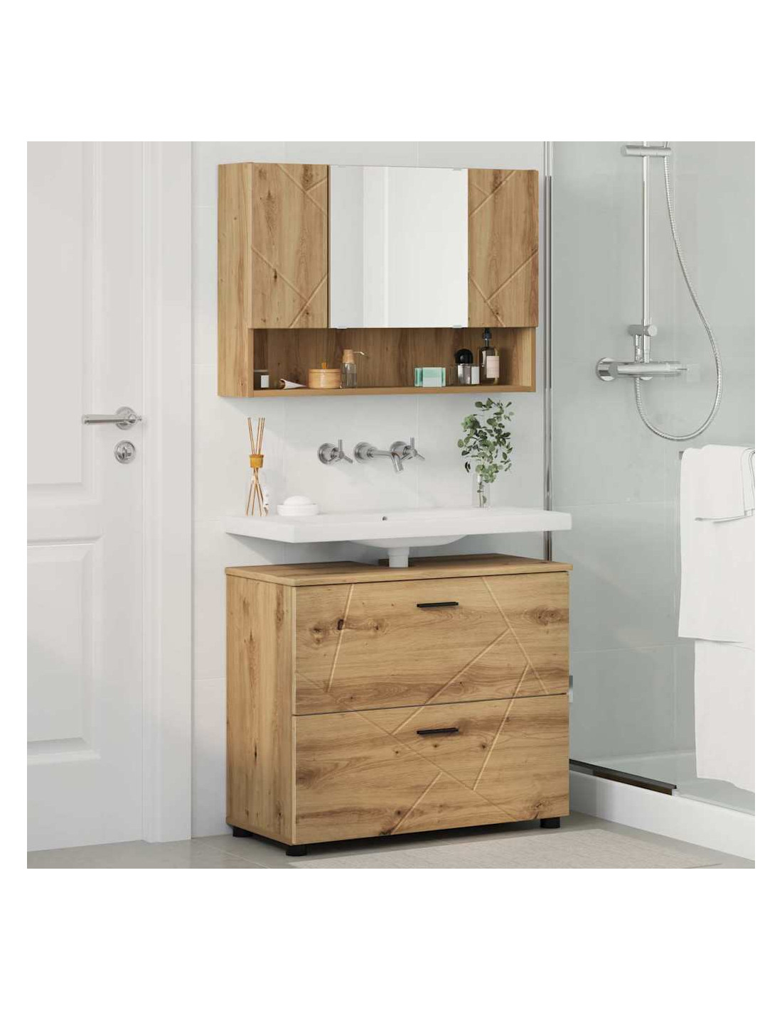 Il Set di Mobili da Bagno in Legno Ingegnerizzato combina perfettamente stile moderno e design pratico. Con linee pulite e un aspetto liscio, questo set migliora l'atmosfera del tuo bagno, fornendo soluzioni di stoccaggio solide. È perfetto per chi ama la semplicità e l'uso intelligente dello spazio, con un look elegante e una robusta struttura in legno ingegnerizzato, ideale per la vita in città. L'atmosfera chic e minimalista del set porta calma al bagno. Con funzionalità come mobili specchiera e ampi scaffali, soddisfa tutti i requisiti per riporre articoli da toeletta, asciugamani e altri oggetti essenziali.