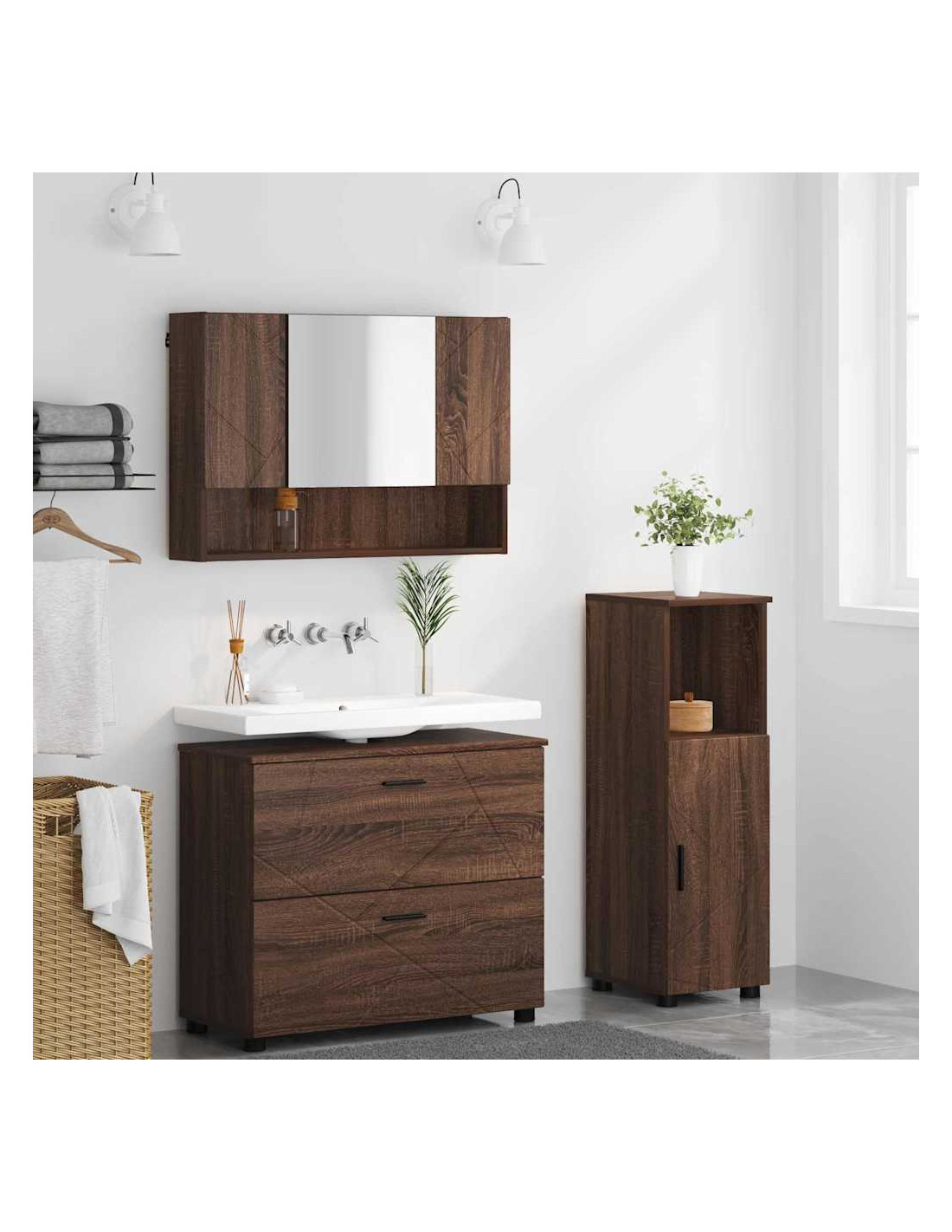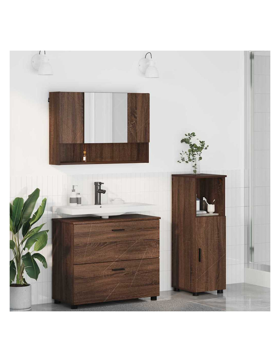 - Componenti Inclusi: Il set comprende un armadietto per lavabo, un armadietto con specchio e un armadietto extra. Questi pezzi offrono un sacco di spazio e sono utili sia per la cura personale che per la decorazione.