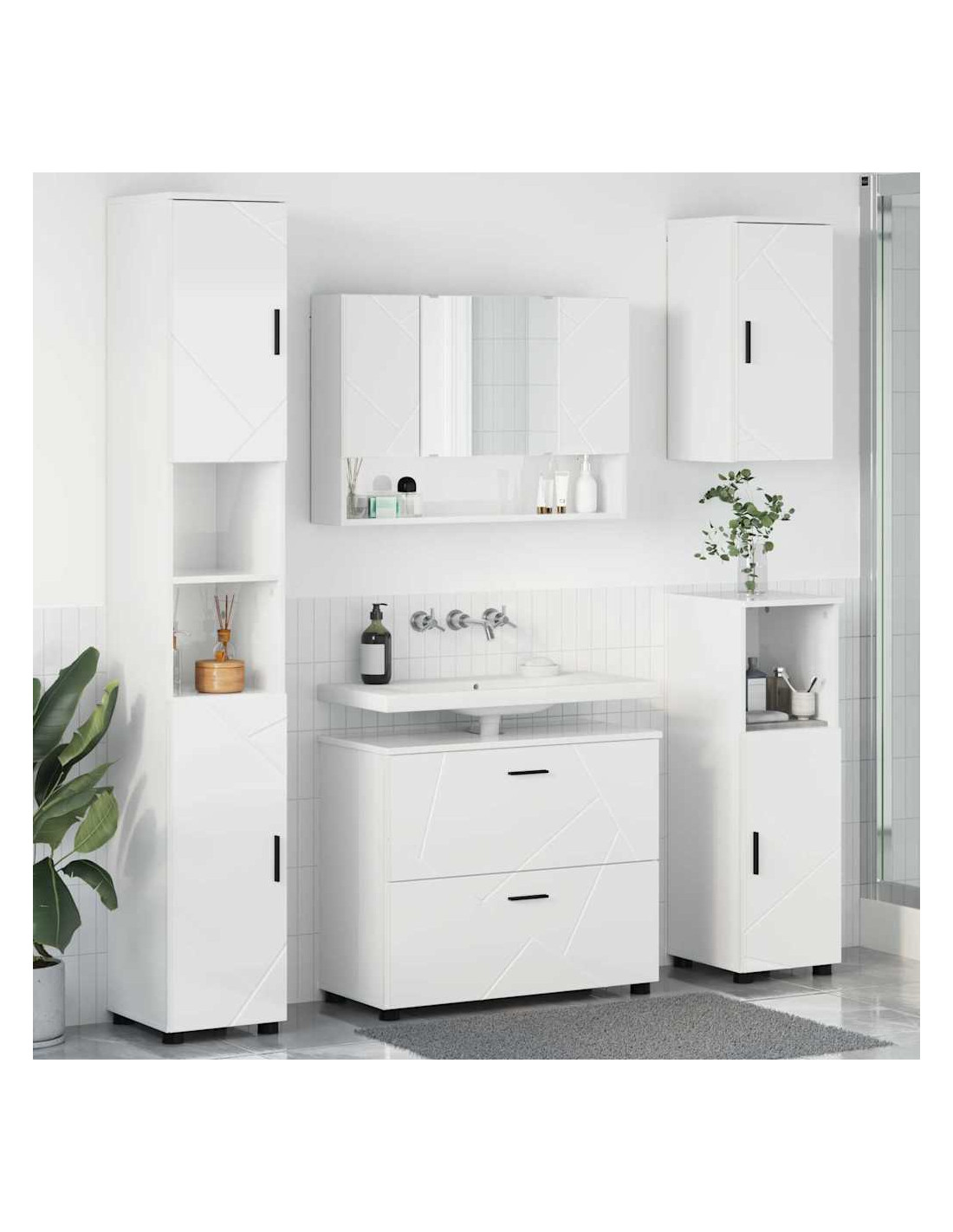 - Componenti di Archiviazione Intelligenti: Il set include un mobile lavabo, un mobile specchio e altri tre armadi progettati per uno stoccaggio intelligente. Ogni pezzo sfrutta lo spazio con funzionalità pratiche come mensole, porte e cassetti, tutti in legno ingegnerizzato robusto per garantire durata.