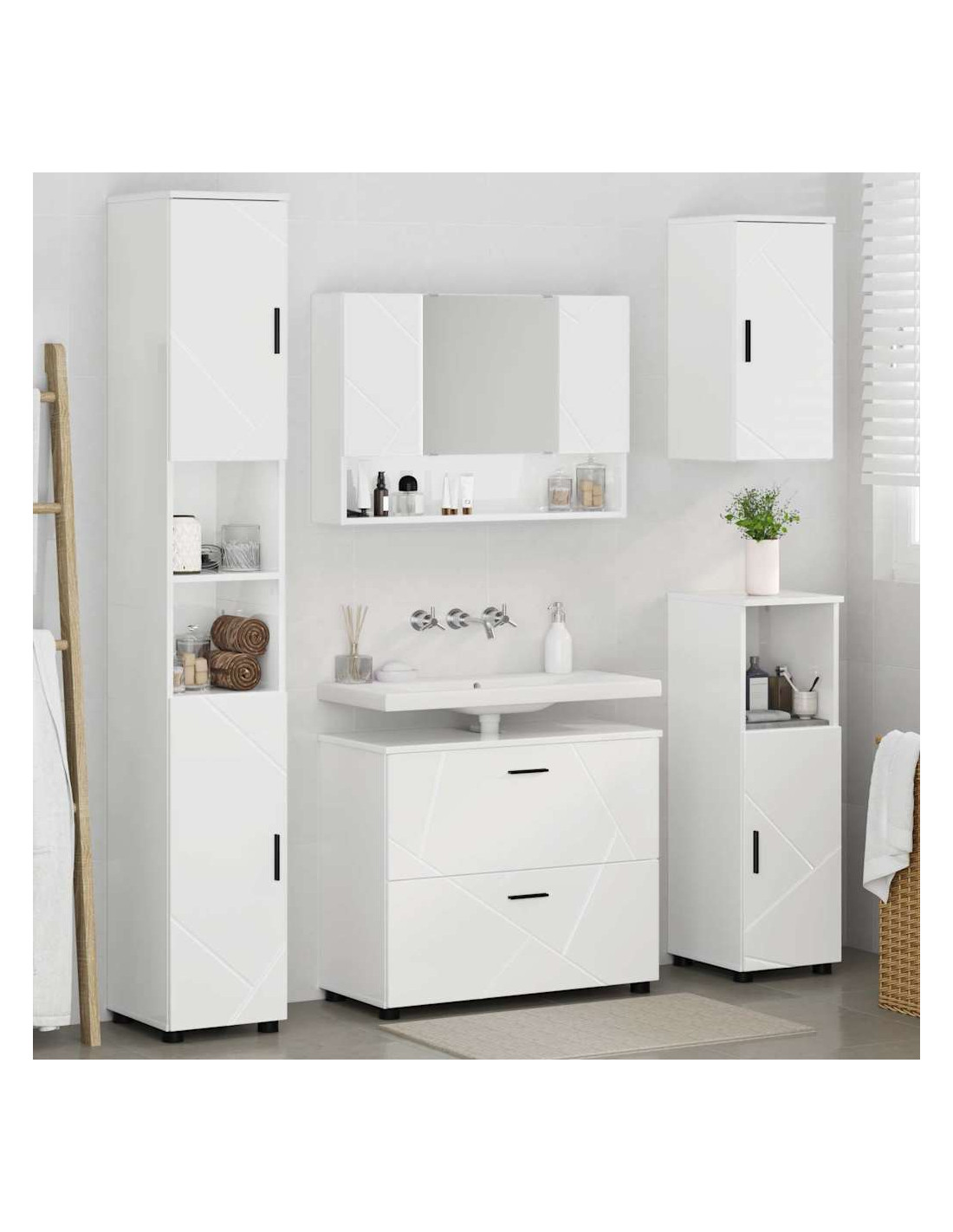 Questo set di mobili per il bagno in legno ingegnerizzato dà un tocco moderno e intelligente a qualsiasi bagno. È pensato per tutti, unendo stile e praticità in modo armonioso. La finitura liscia e opaca lo rende elegante senza essere kitsch, perfetto sia per stili minimalisti che per decorazioni più elaborate.