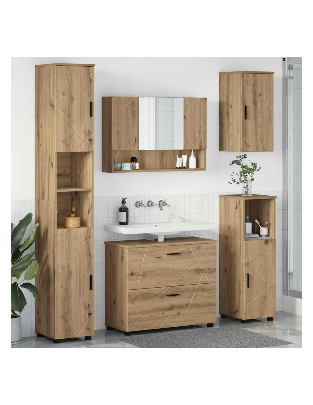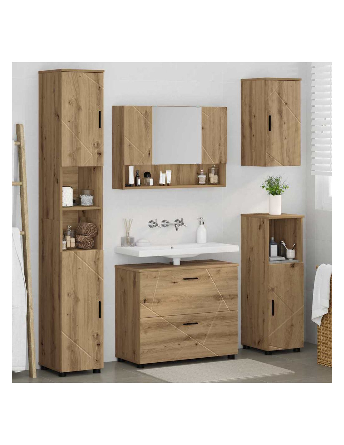 - Componenti di Archiviazione Intelligenti: Il set include un mobile lavabo, un mobile specchio e altri tre armadi progettati per uno stoccaggio intelligente. Ogni pezzo sfrutta lo spazio con funzionalità pratiche come mensole, porte e cassetti, tutti in legno ingegnerizzato robusto per garantire durata.