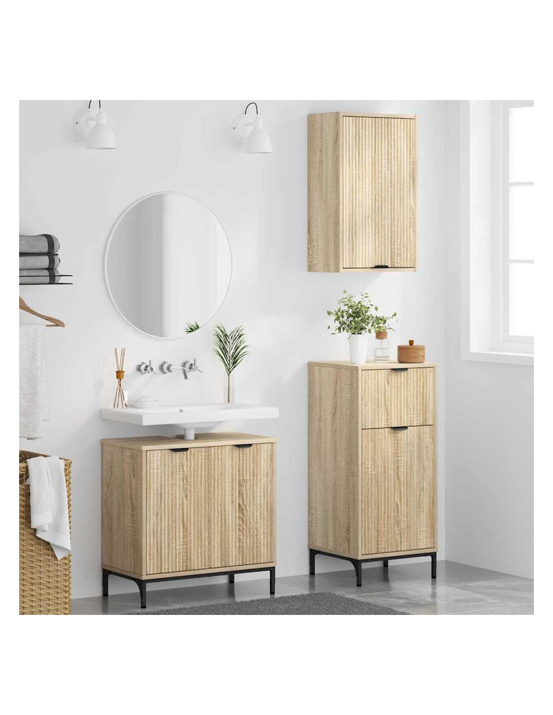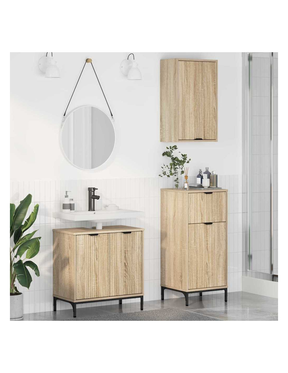 - Componenti Inclusi: Questo set comprende un mobile per lavabo e due armadi, tutti con porte a cerniera e mensole pratiche per riporre i cosmetici. Le mensole facilitano l'organizzazione degli oggetti per il bagno.
