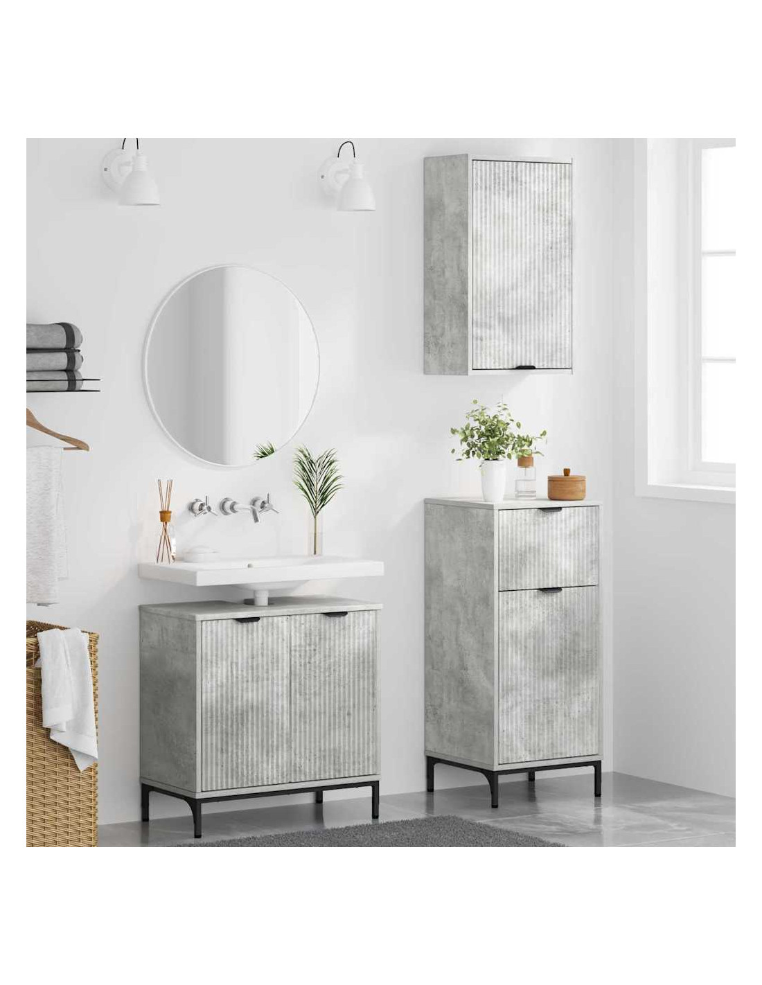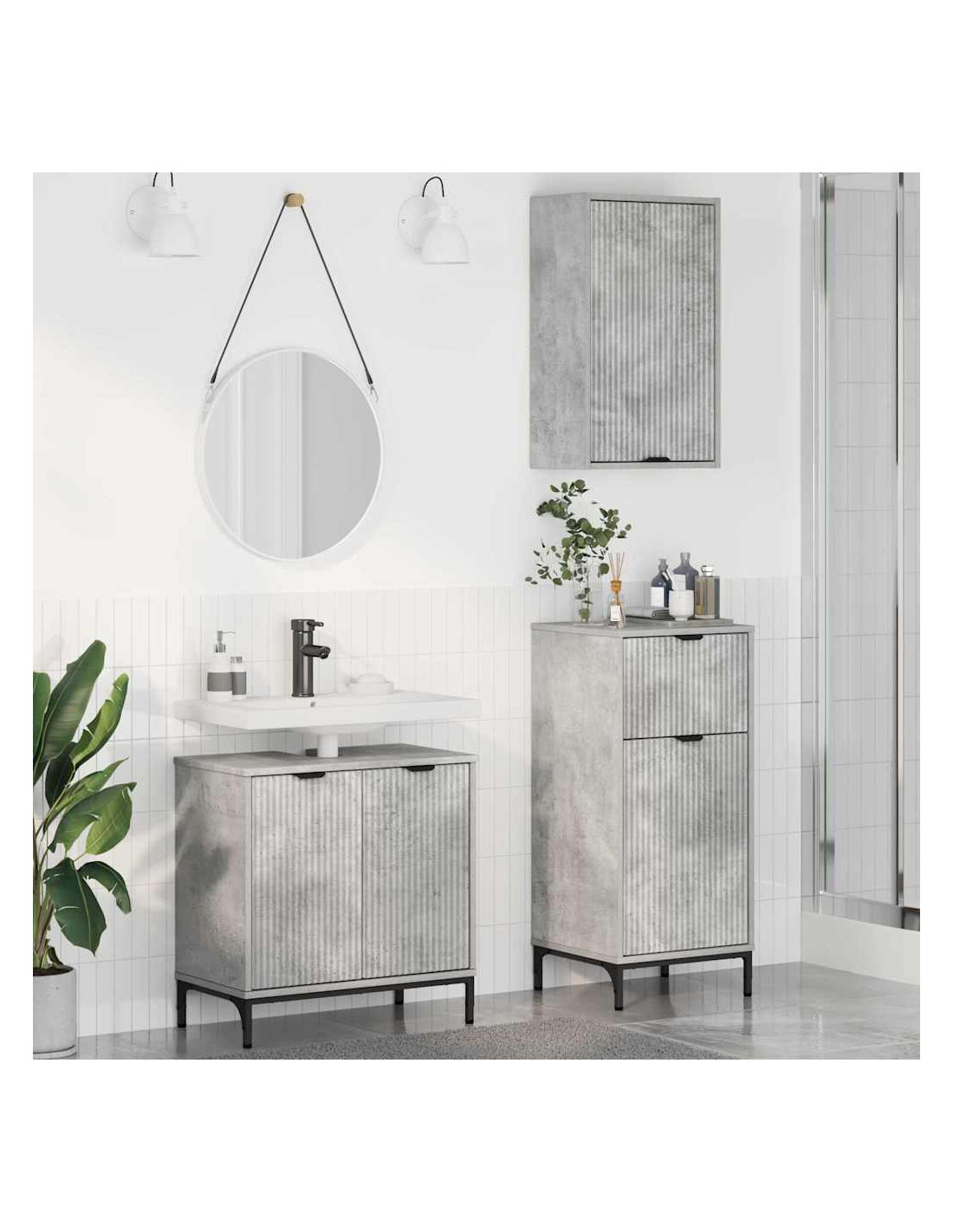 - Componenti Inclusi: Questo set comprende un mobile per lavabo e due armadi, tutti con porte a cerniera e mensole pratiche per riporre i cosmetici. Le mensole facilitano l'organizzazione degli oggetti per il bagno.