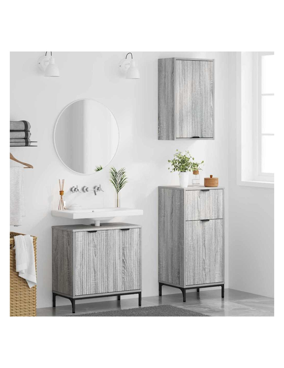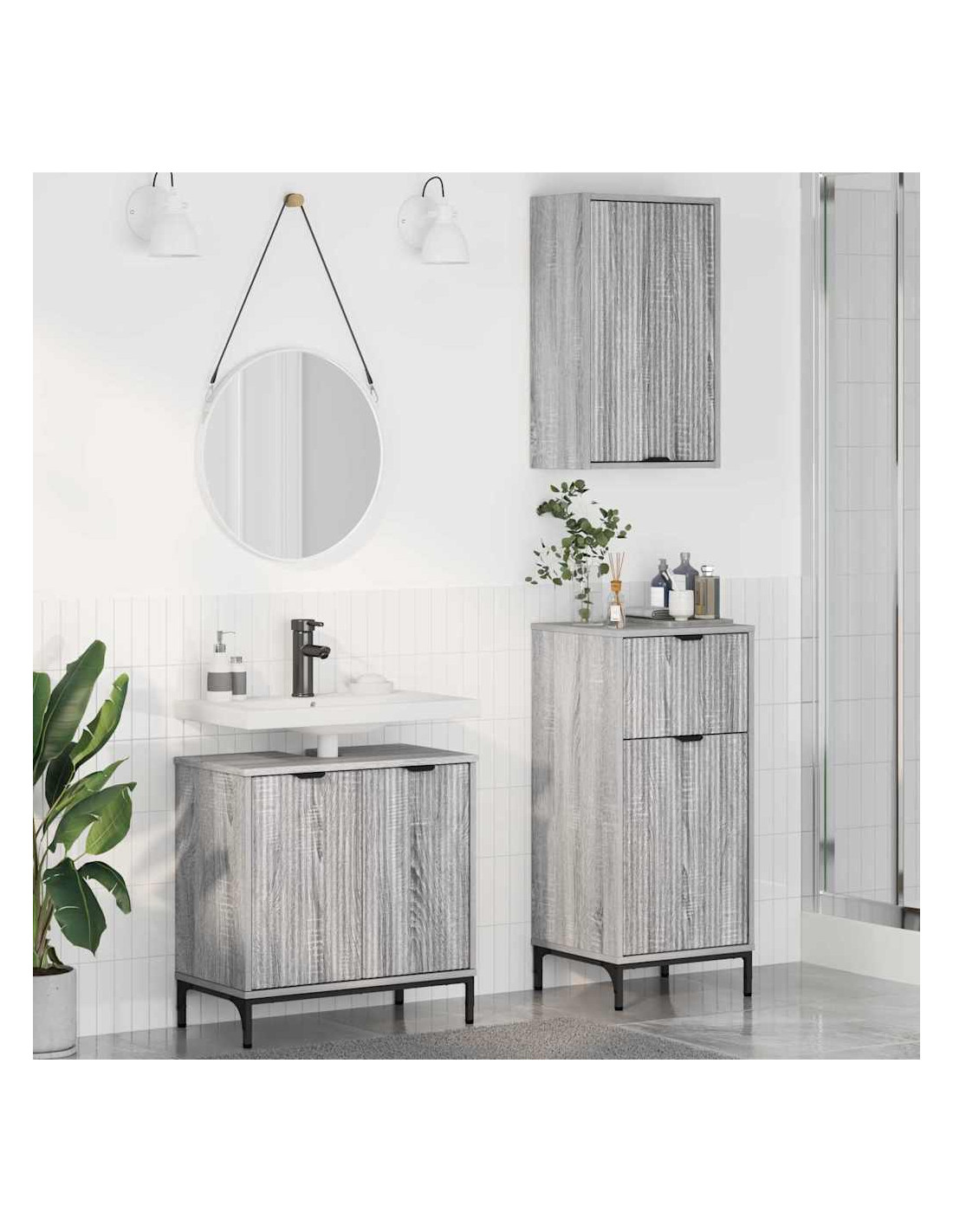 - Componenti Inclusi: Questo set comprende un mobile per lavabo e due armadi, tutti con porte a cerniera e mensole pratiche per riporre i cosmetici. Le mensole facilitano l'organizzazione degli oggetti per il bagno.