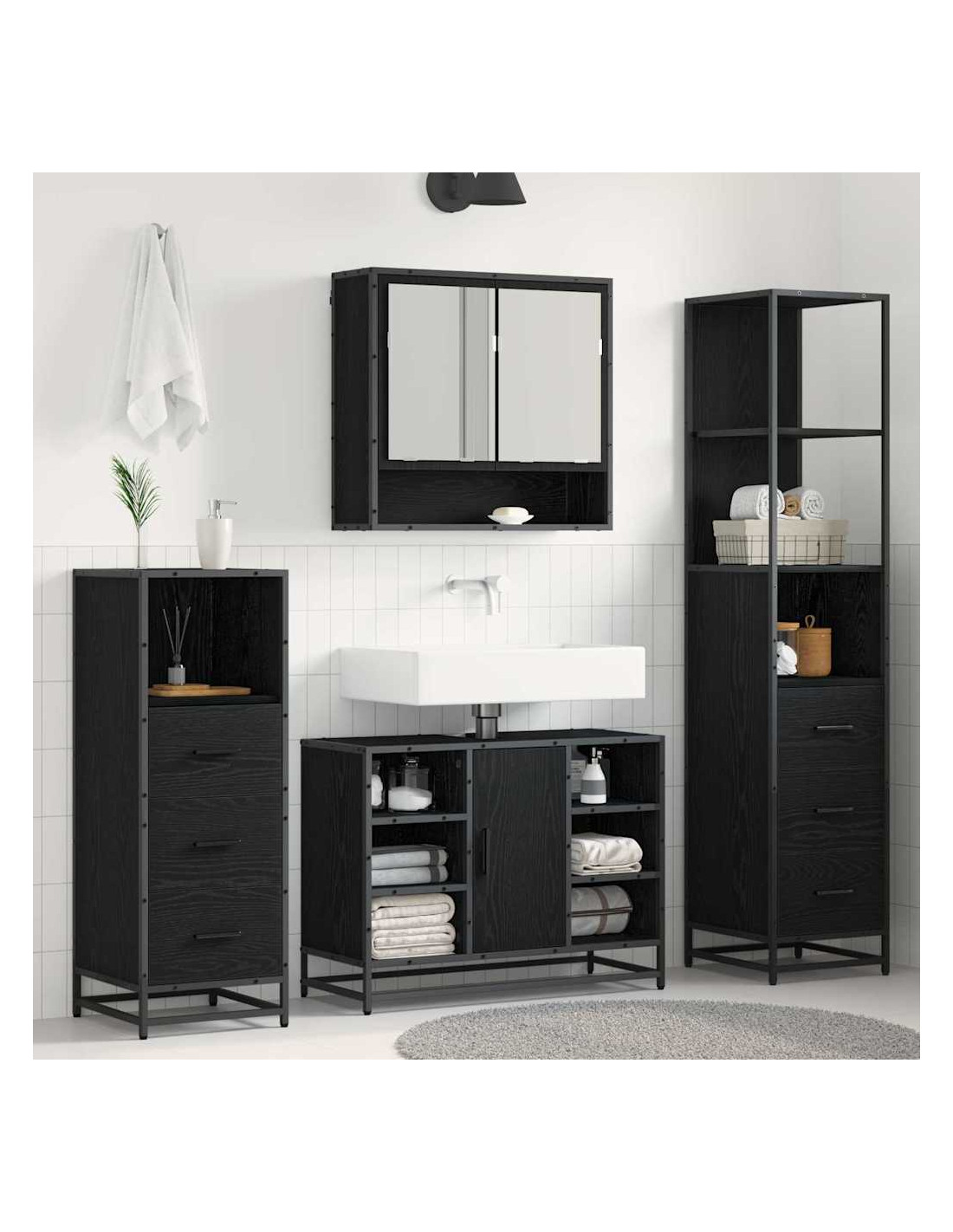 - Materiali di Qualità: Fatto in legno ingegnerizzato, questo set da bagno è solido e affidabile per l'uso quotidiano. La combinazione di legno ingegnerizzato e metallo è fantastica e resiste all'umidità e all'usura. Questi materiali premium assicurano un'installazione robusta e duratura.