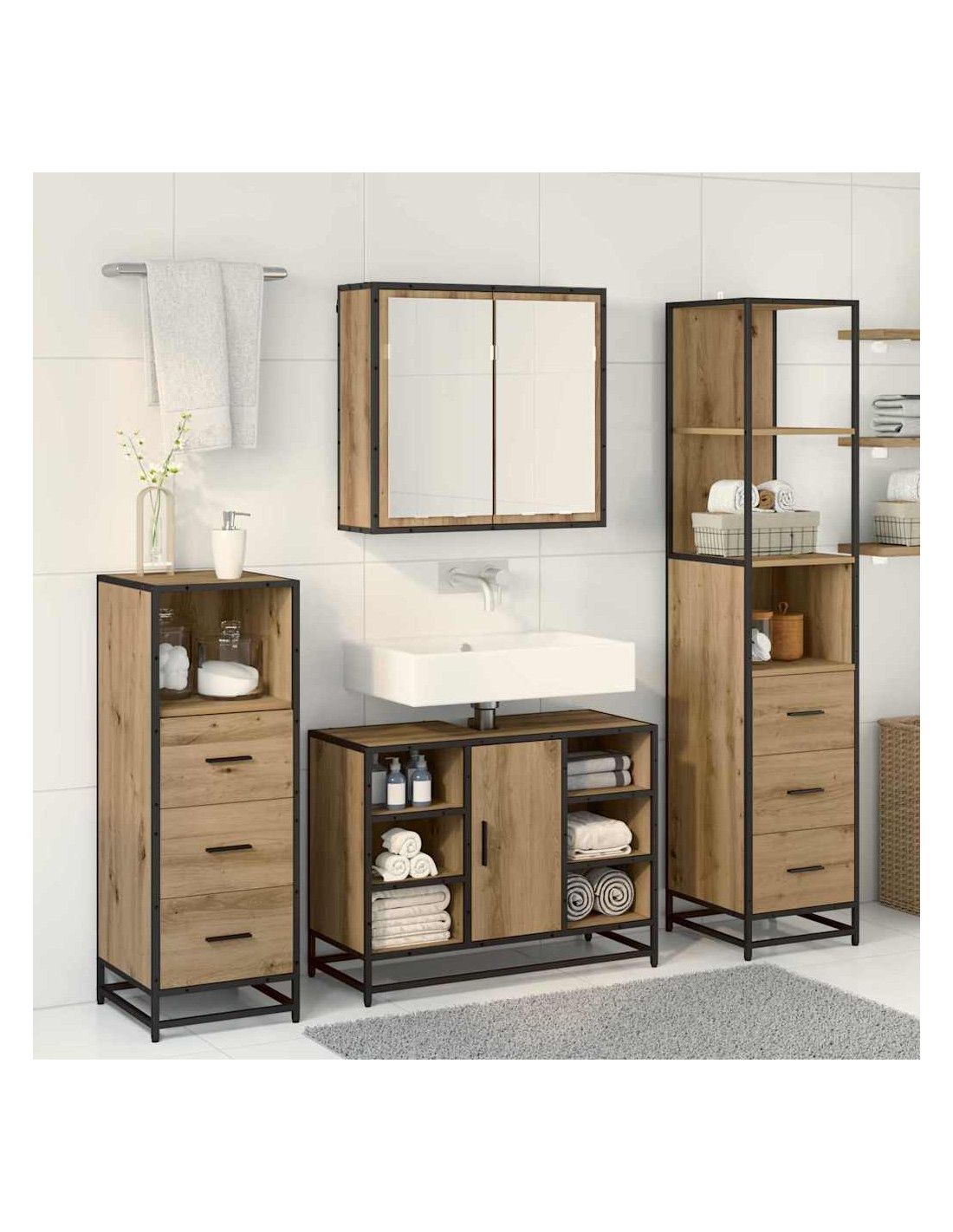Questo Set di Mobili per il Bagno in Legno è il mix ideale di stile moderno e praticità, progettato per arricchire qualsiasi bagno contemporaneo. Le sue linee pulite e il profilo semplice si adattano benissimo a un arredamento minimalista, rendendo ogni cosa speciale. Immagina come la fusione di materiali industriali e ottima lavorazione gli dia un aspetto unico, che sicuramente migliorerà l'atmosfera del tuo bagno con un'eleganza sobria.