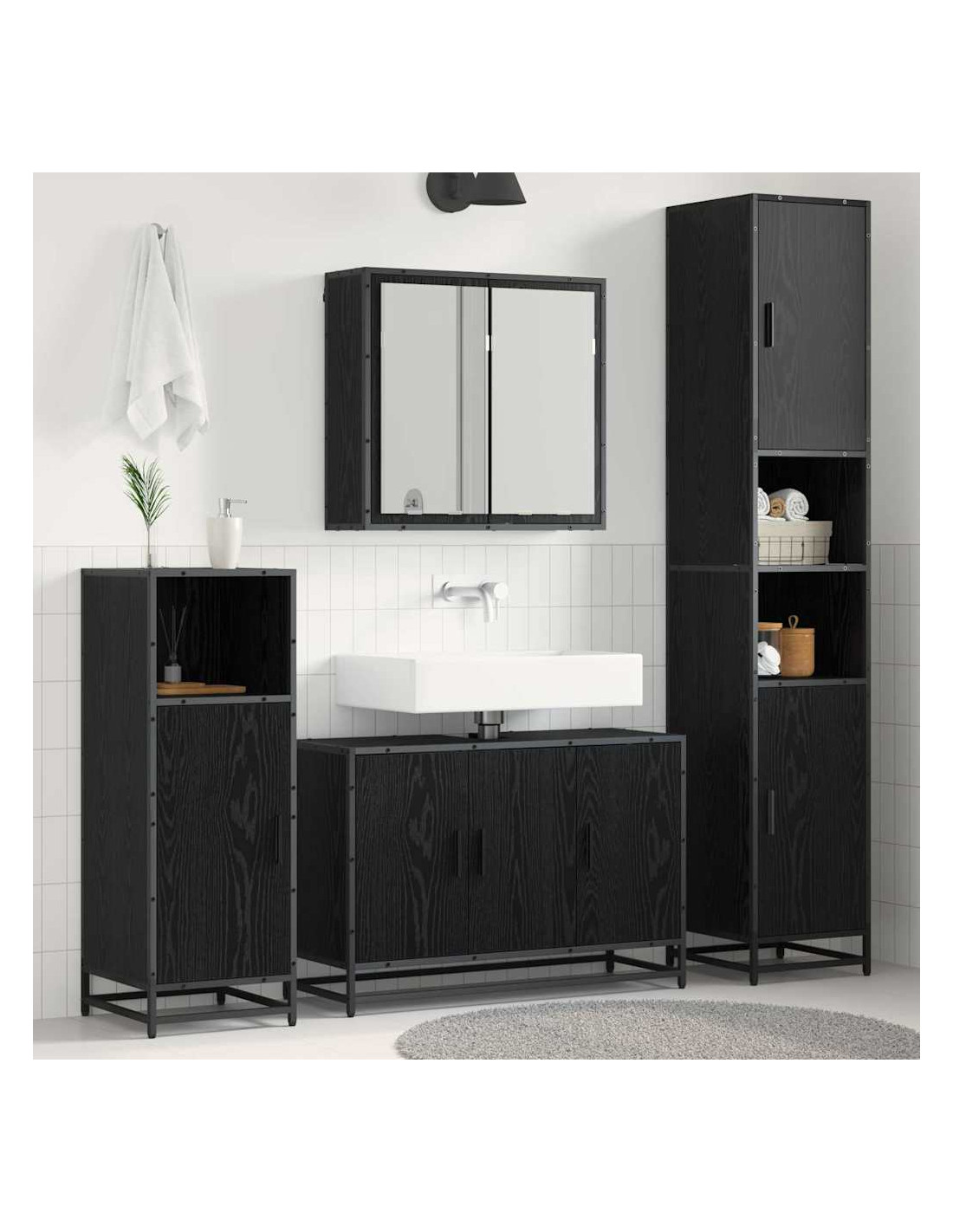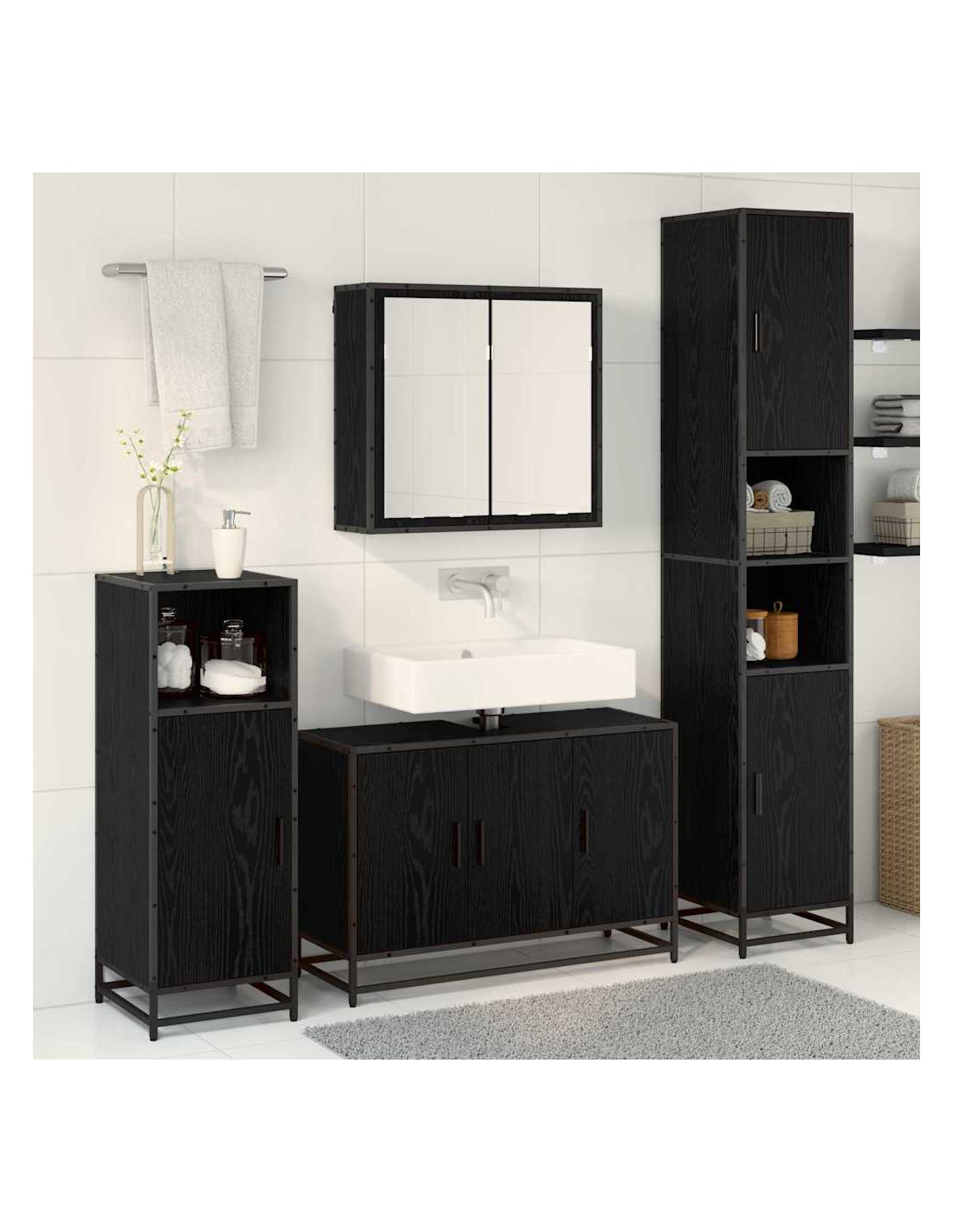 - Funzionalità al Top: Il set include un mobile specchio, un mobile lavabo a porta filo e un mobile di stoccaggio con maniglie a barra. Ogni pezzo è progettato per aiutarti a rimanere organizzato. Lo specchio è perfetto per le tue routine quotidiane, mentre gli armadi offrono tanto spazio per le tue cose da bagno, mantenendo tutto in ordine.