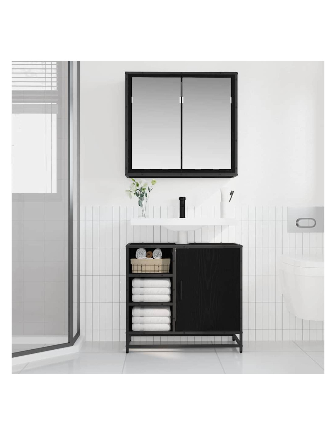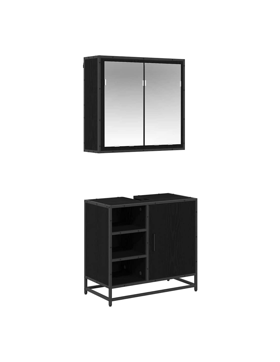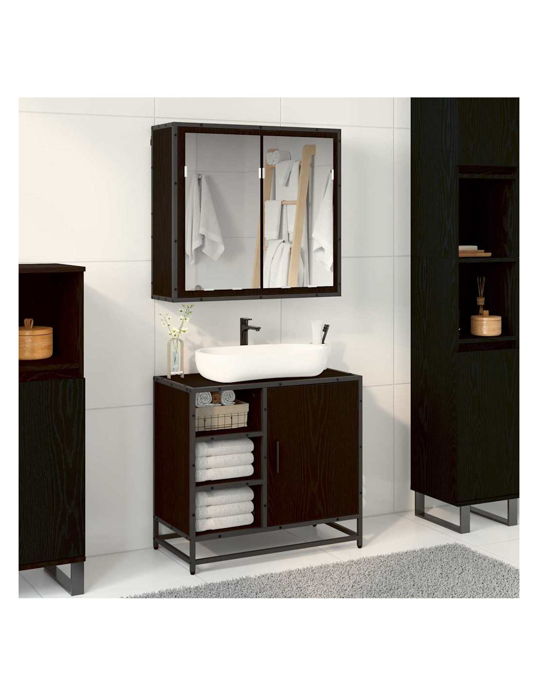 - Materiale: Realizzato in legno ingegnerizzato robusto e metallo, questo set è progettato per durare. È resistente all'umidità, il che lo rende adatto per i bagni, combinando praticità e un tocco moderno.