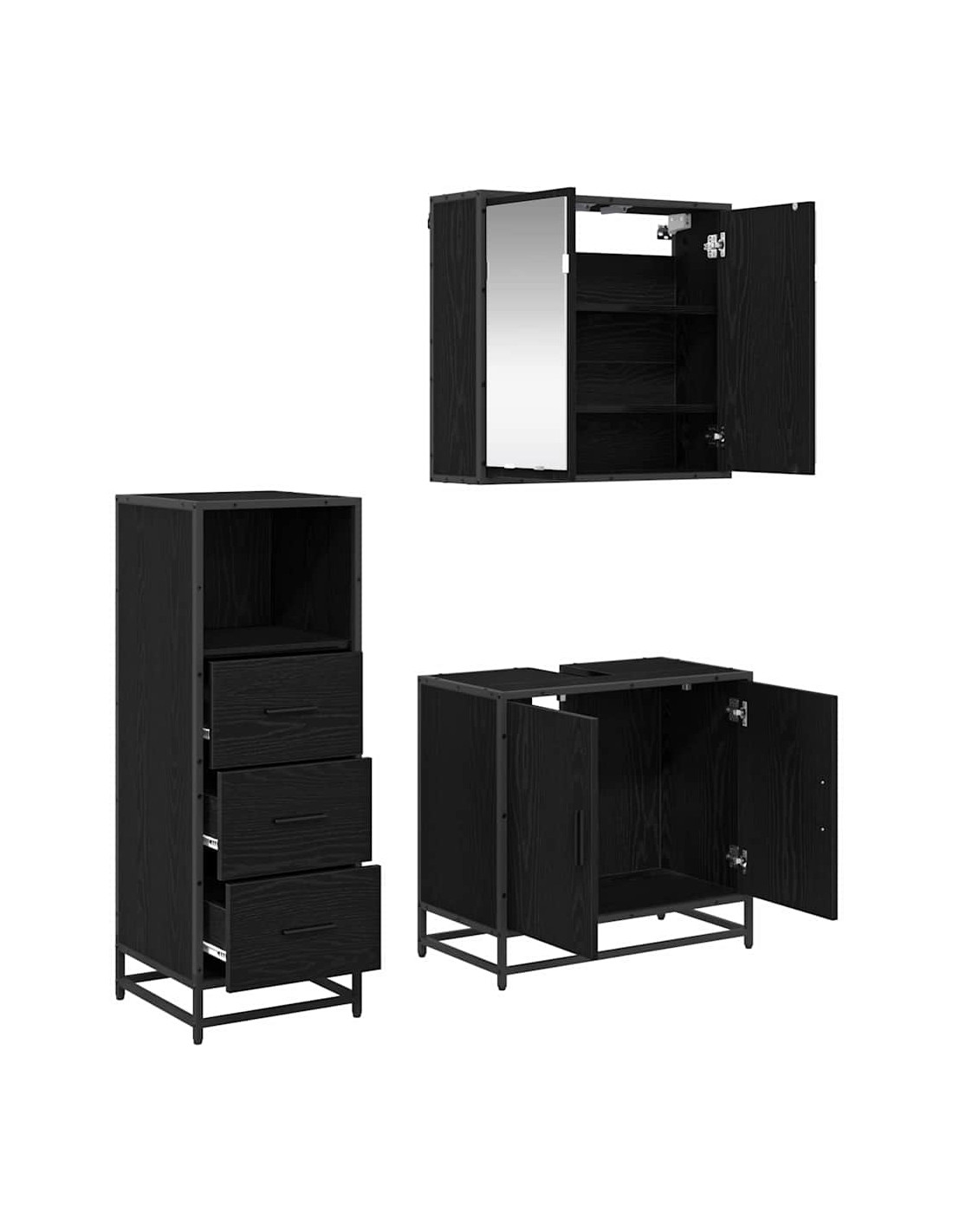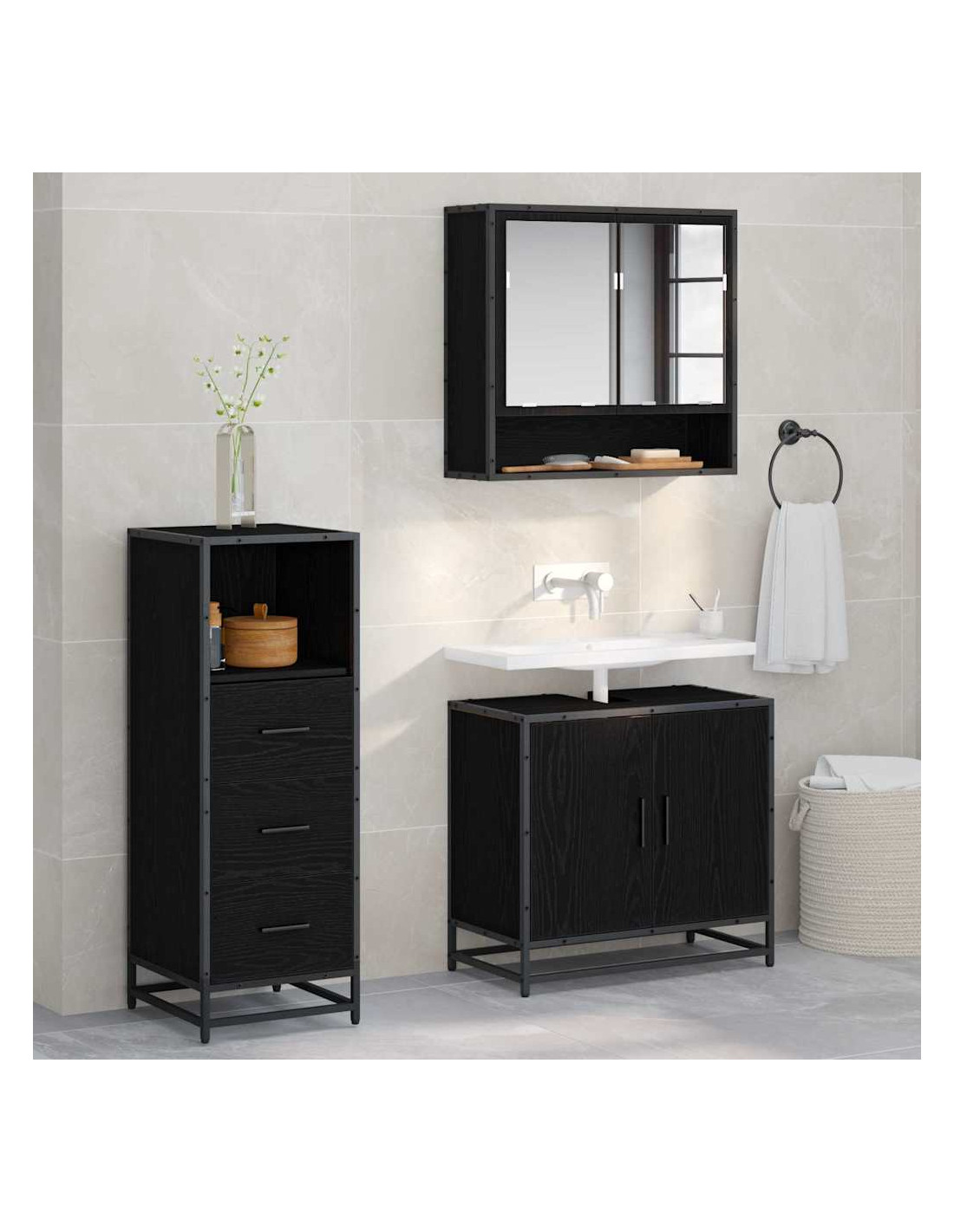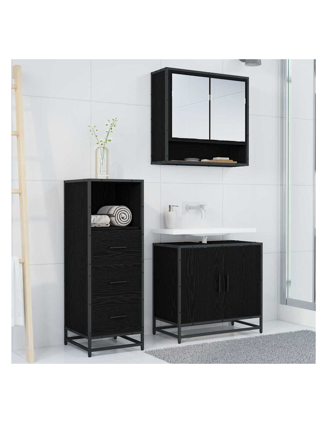 - Legno ingegnerizzato e metallo: Questo set è fatto di robusto legno ingegnerizzato e ha dettagli metallici che aggiungono stabilità e stile. Questi materiali sono facili da mantenere e permettono al tuo bagno di rimanere in ottime condizioni per anni.