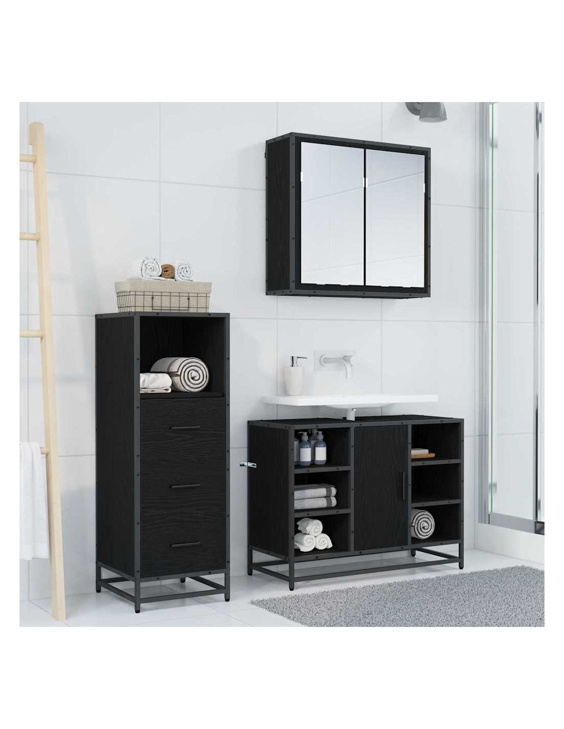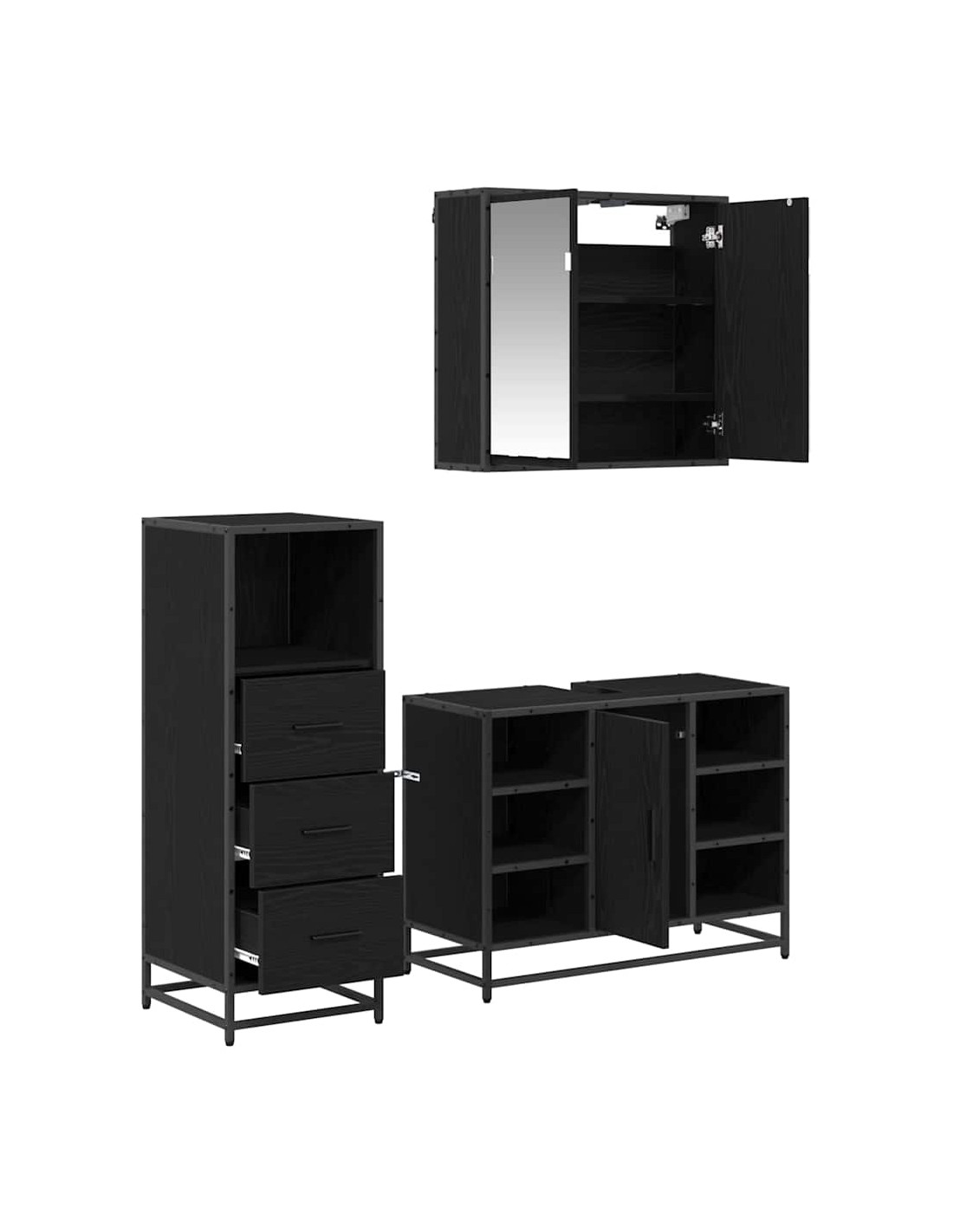 - Componenti Completi: Include tutto il necessario: un mobiletto con specchio, un mobiletto per il lavandino e un armadietto. Ogni pezzo è progettato per essere funzionale e bello, offrendoti ottime soluzioni di stoccaggio.