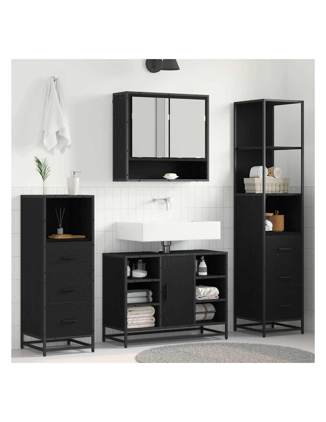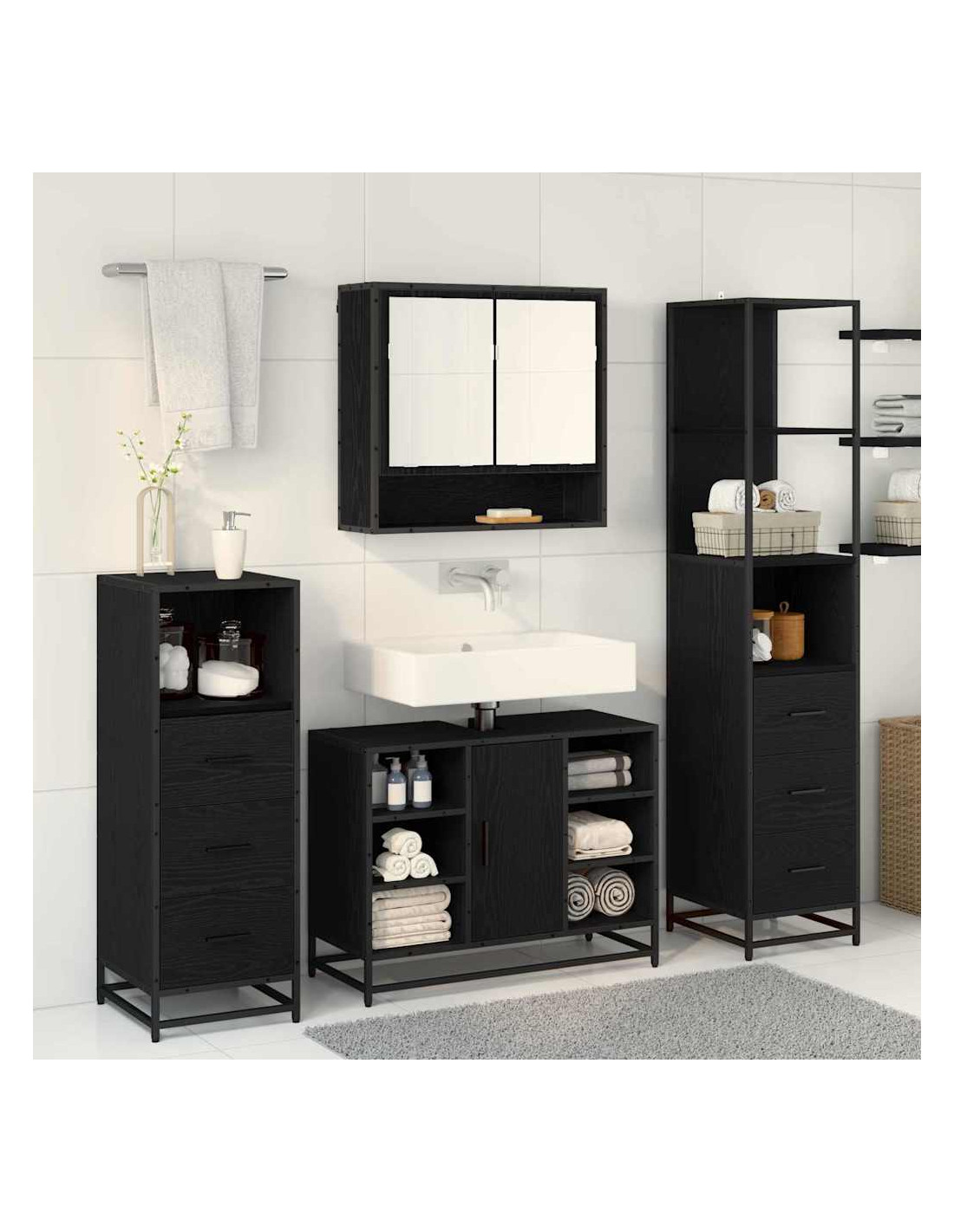 - Stile contemporaneo: Con linee pulite, finitura opaca e texture eleganti, questo set si sposa perfettamente con il design moderno. La struttura nera e le maniglie sofisticate donano un tocco di classe, rendendolo ideale per ogni bagno attuale.