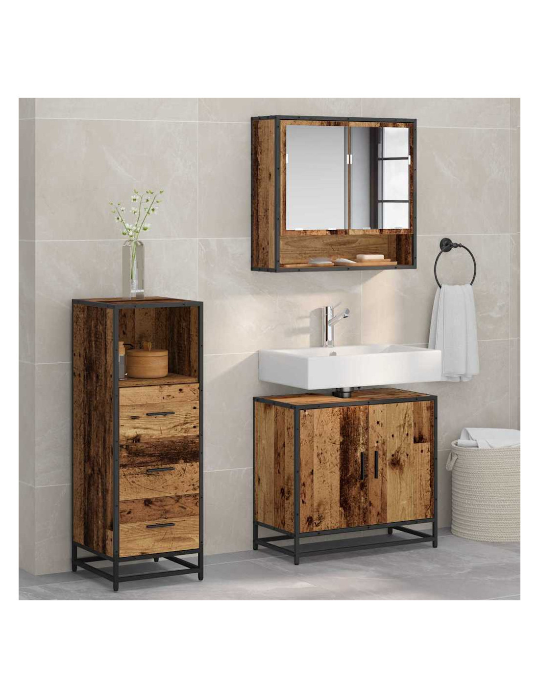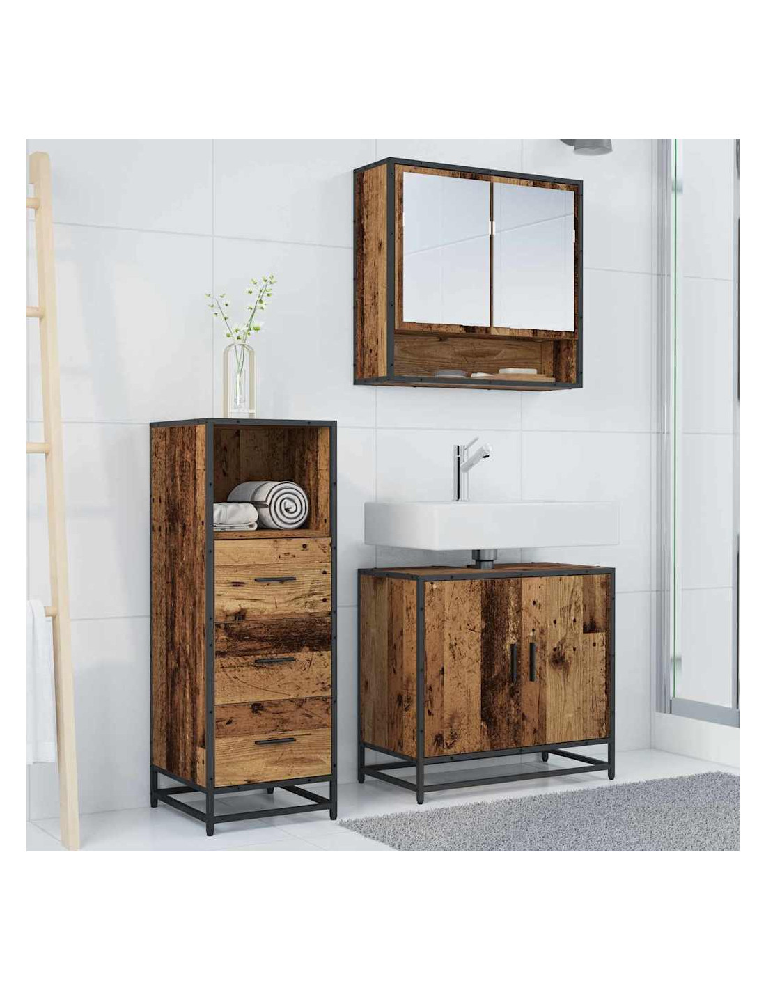 - Legno ingegnerizzato e metallo: Questo set è fatto di robusto legno ingegnerizzato e ha dettagli metallici che aggiungono stabilità e stile. Questi materiali sono facili da mantenere e permettono al tuo bagno di rimanere in ottime condizioni per anni.