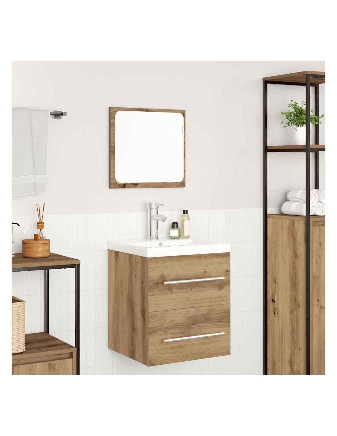 Questo set di mobili Moderno combina stile e funzionalità, con un design minimalista che arricchisce ogni bagno. Ha forme rettangolari e linee semplici e questo mobile a parete dà un look snello, pur offrendo spazio per riporre e farsi belli. Con uno specchio incluso e fatto di legno ingegnerizzato, è l'ideale per famiglie moderne in cerca di una soluzione elegante e pratica.