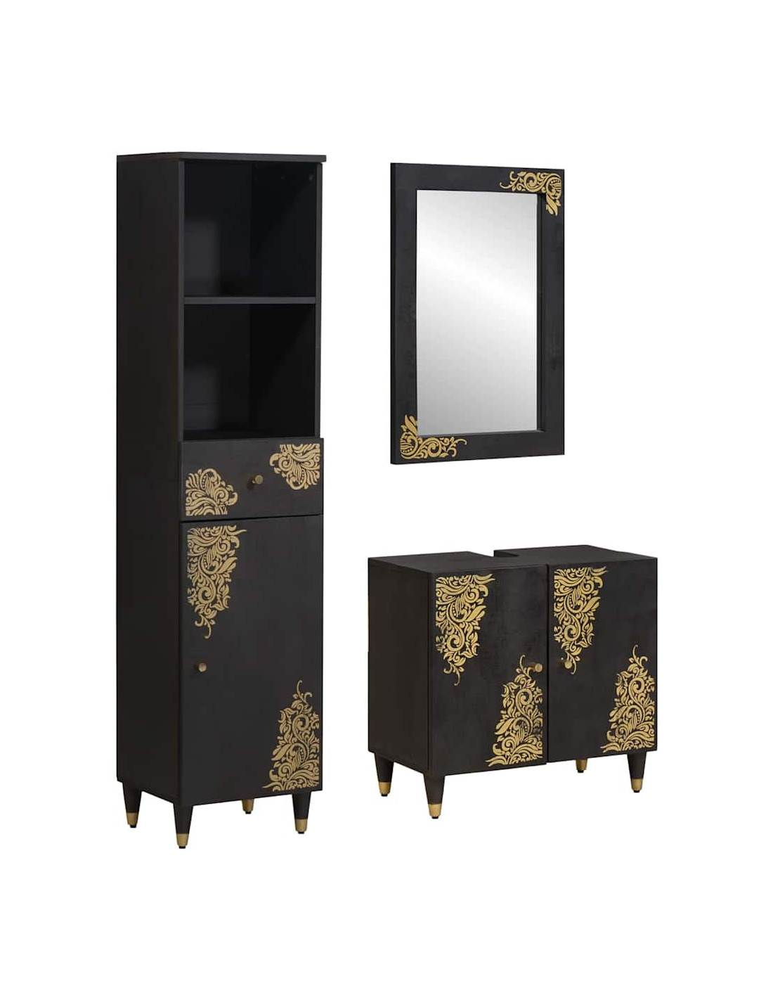 Questo Set di Mobili per Bagno in Legno unisce funzionalità e un aspetto rustico elegante, ideale per chi ama una decorazione più genuina. Fatto in legno massello di mango, offre un tono naturale e terroso, arricchito da dettagli dorati per un tocco di lusso. Si adatta a vari stili di bagno, fornendo tanto spazio per riporre le cose e migliorando l'aspetto della tua stanza. Se vuoi ridurre il disordine e fare una scelta di stile, questo set di mobili è la soluzione perfetta.