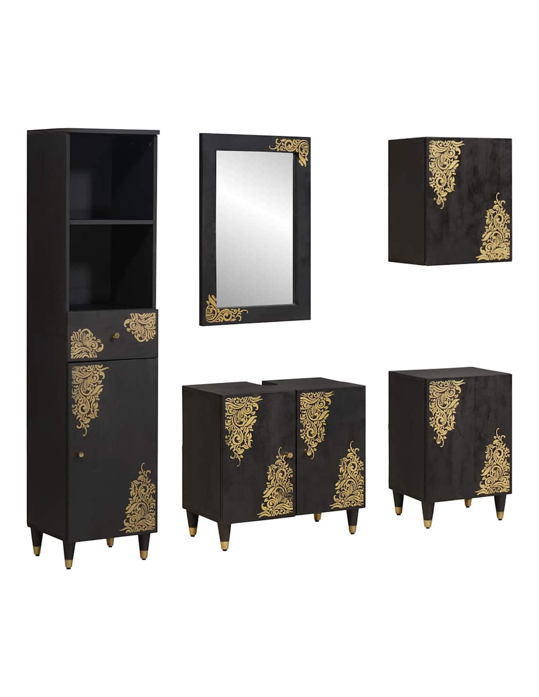 Questo set di armadi per il bagno in legno è l'ideale per il fascino rustico, combinando materiali naturali con una lavorazione di alta qualità. Progettato per migliorare qualsiasi bagno, include pezzi funzionali che offrono stile e praticità. Ogni pezzo è attentamente realizzato per garantire bellezza e utilità, migliorando l'aspetto del tuo bagno. Realizzato in legno massello di mango con dettagli dorati, questo set trasmette calore e raffinatezza.
