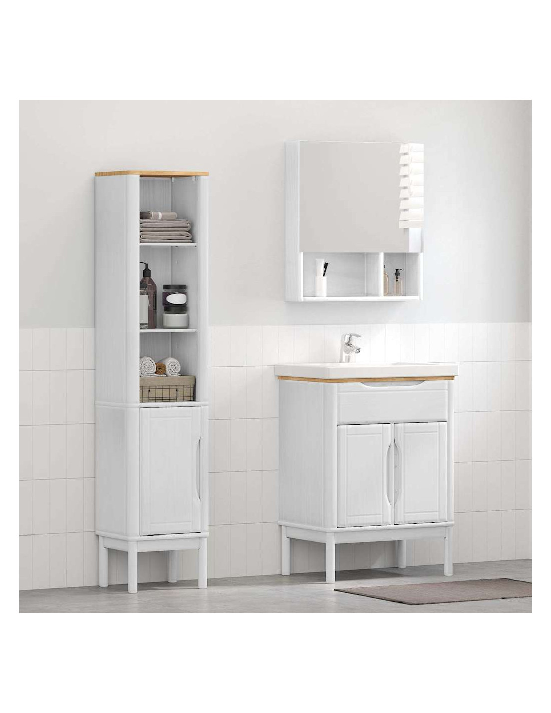 - Costruzione in pino massello Questo set di mobili per bagno è realizzato in legno massello di pino, un mix perfetto di resistenza e bellezza. Ogni dettaglio è curato per garantirne la robustezza. La venatura naturale del legno aggiunge un tocco di stile al tuo bagno.