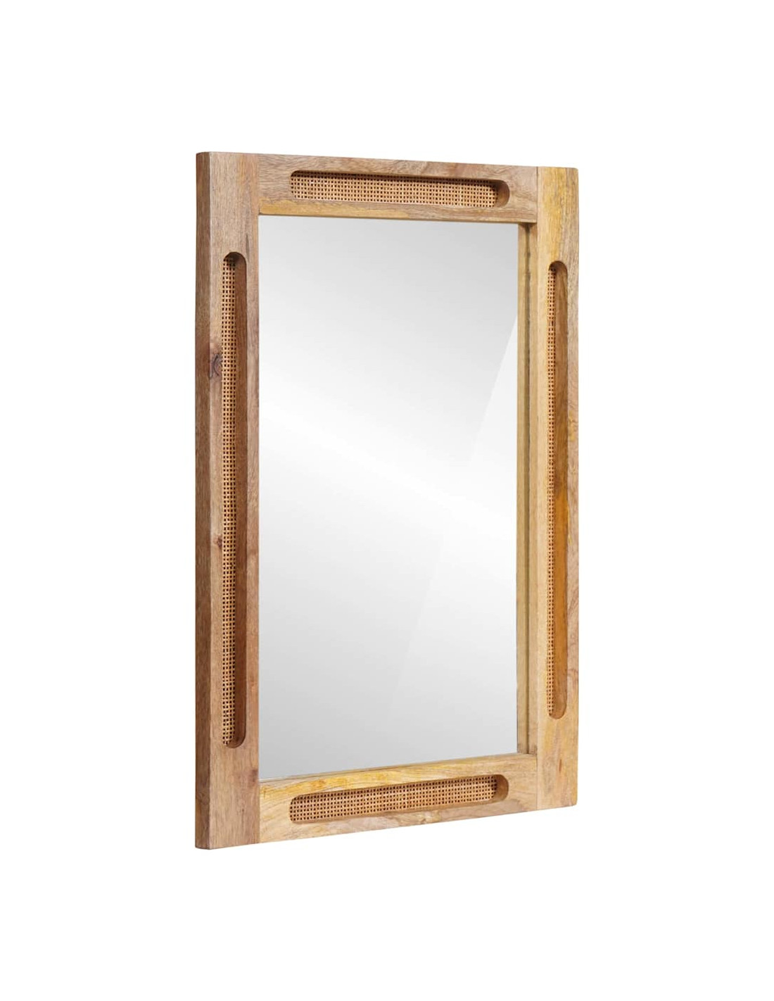 - Materiali: Questo specchio è realizzato in legno massello di mango, noto per la sua resistenza e bellezza. La finitura naturale mostra la venatura, dando un tocco lussuoso al tuo bagno.