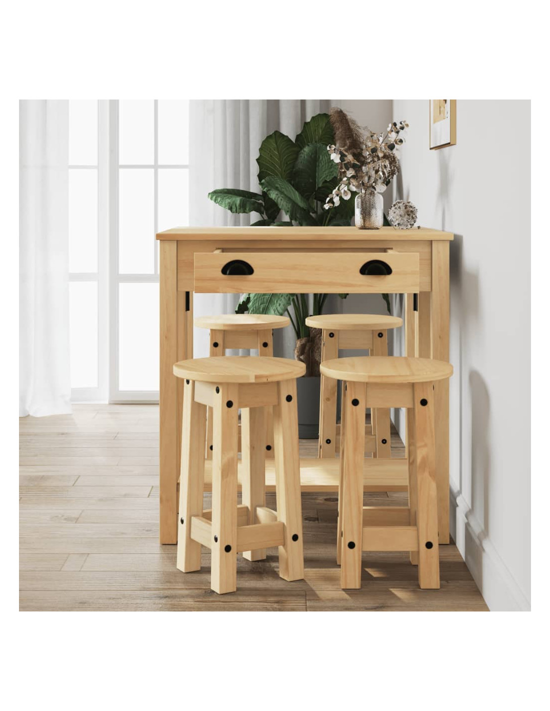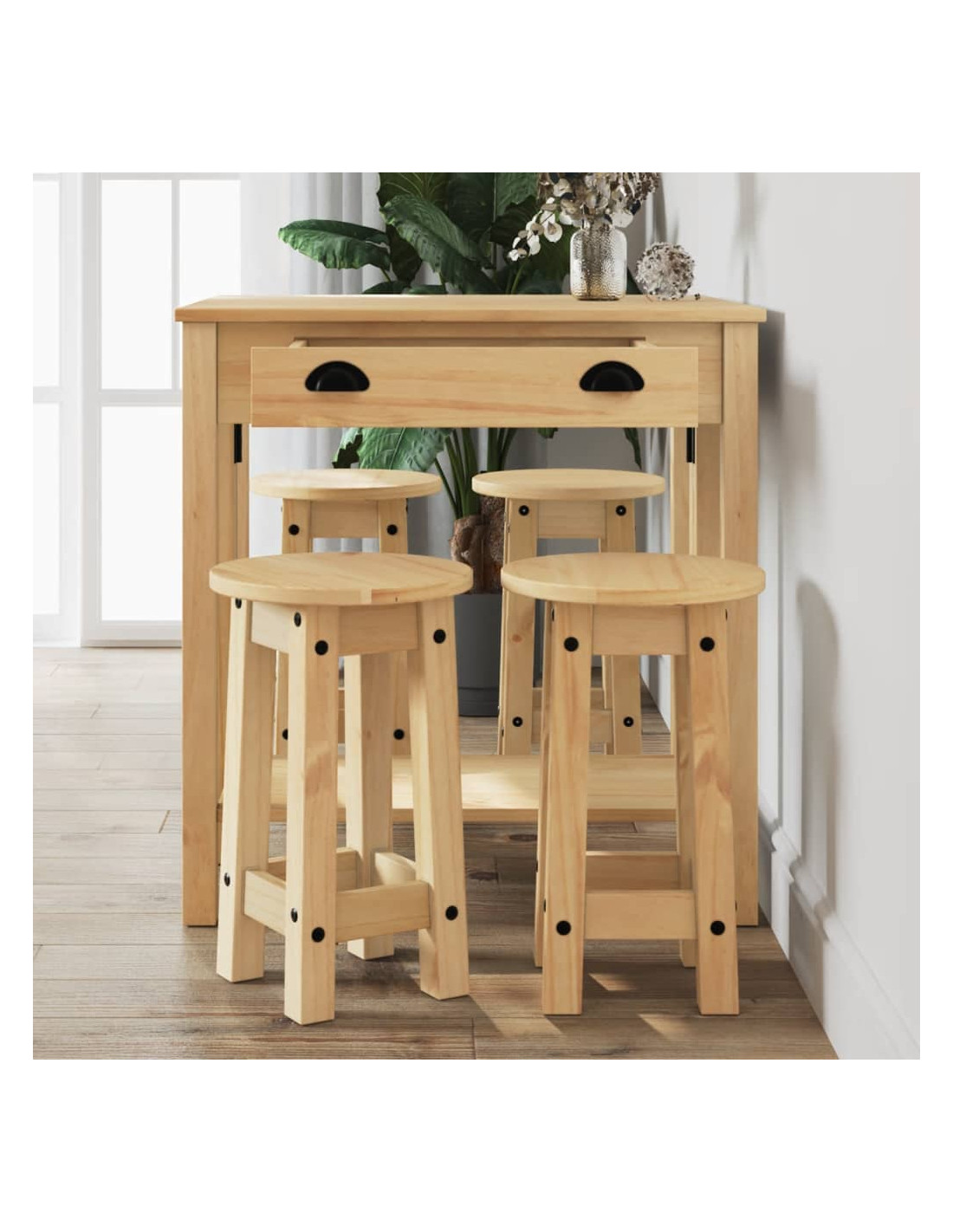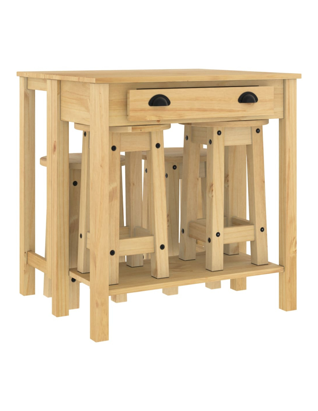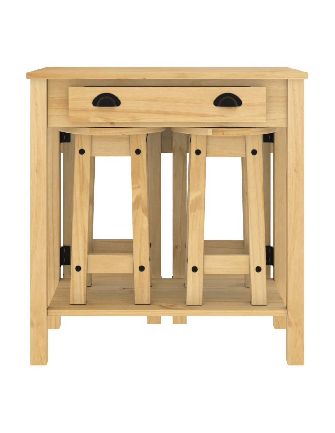 Sorseggiate un calice del vostro vino preferito o godetevi un buon pasto con la vostra famiglia e i vostri amici attorno a questo splendido set da bar in legno! Legno massello di pino: Questo set da bar è realizzato in legno di pino massello. Il legno massello di pino è un bellissimo materiale naturale. Il legno di pino ha le venature dritte e i nodi conferiscono al materiale il suo caratteristico aspetto rustico.Design pratico: Lo sgabello da bar in legno non ha lo schienale, quindi potete sedervi comodamente su entrambi i lati dello sgabello e riporlo sotto il piano di lavoro quando non è in uso.Piano pieghevole: Questo tavolino da bar è dotato di un piano pieghevole, perfetto per posizionare bevande, cibo e oggetti decorativi. Può anche essere facilmente ripiegato quando non è in uso.Ampie applicazioni: Il tavolo e le sedie da bar presentano un design minimalista che si adatta a qualsiasi ambiente della casa. Può essere utilizzato in cucina, sala da pranzo, soggiorno, e così via.