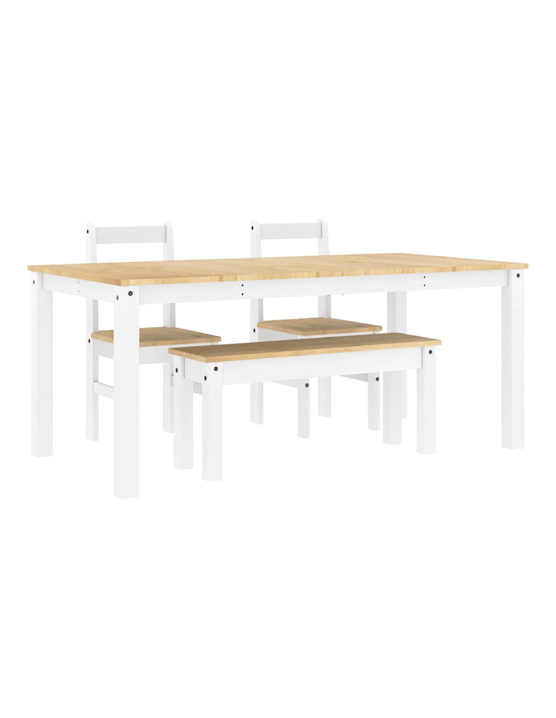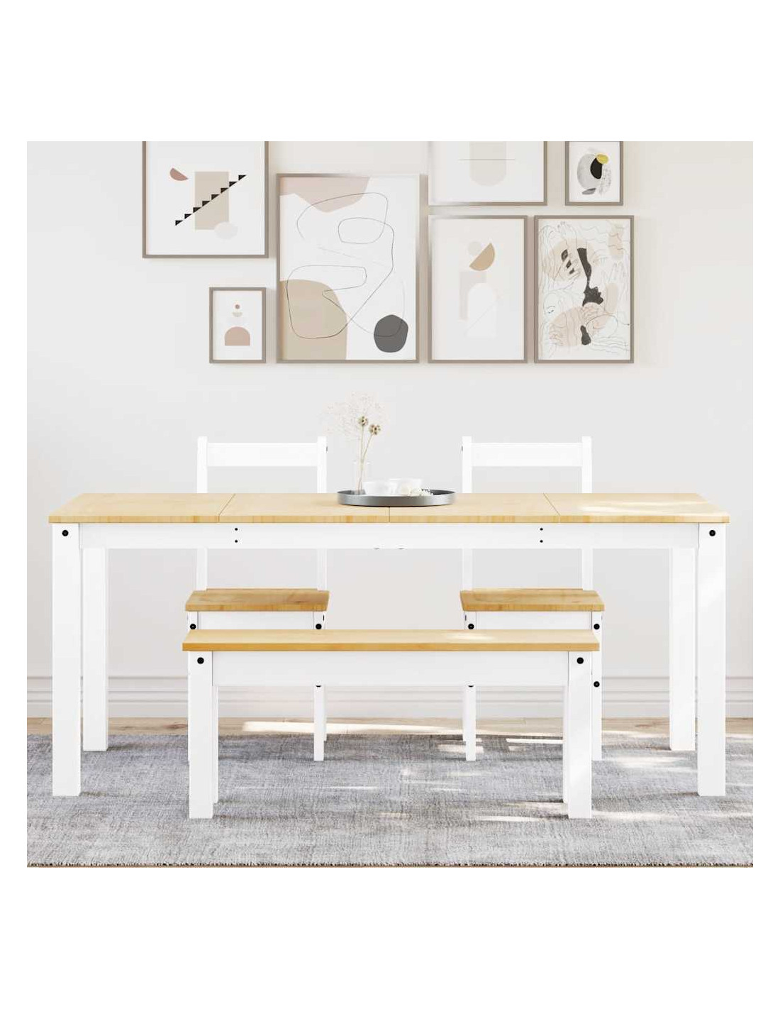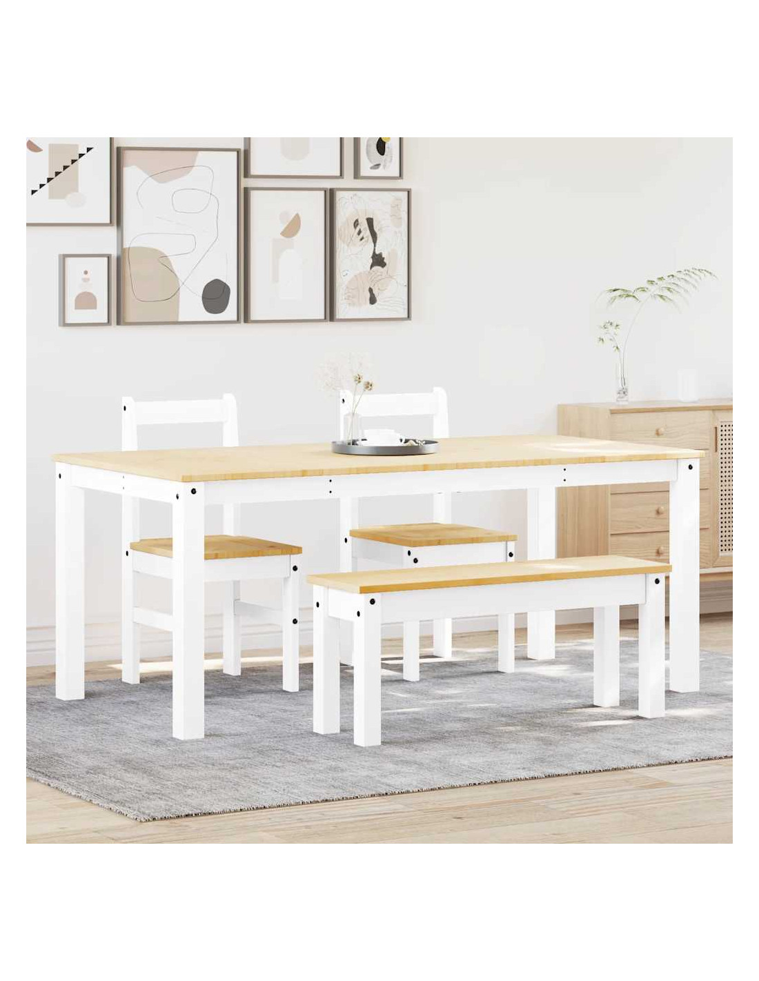 Crea un luogo caldo e invitante per iniziare la giornata o goditi un ottimo pasto insieme a questo set da pranzo in legno! Materiale robusto e stabile: Il legno massello di pino è noto per la sua resistenza e durata. Le sue venature dritte e i suoi nodi caratteristici contribuiscono al suo fascino rustico.Piano del tavolo robusto: questo tavolo da pranzo è dotato di un piano resistente, che lo rende ideale per servire pasti, spuntini, bevande e mettere in mostra le vostre decorazioni preferite.Ampia seduta: grazie alla generosa seduta della panca, questo set da pranzo è perfetto per riunire la famiglia e gli amici per un pranzo delizioso.Facile manutenzione: grazie alla sua superficie liscia, il set da pranzo è facile da pulire con un panno umido e richiede meno manutenzione.Ampie applicazioni: Il set di tavoli da pranzo presenta un design minimalista per adattarsi a qualsiasi ambiente della tua casa. Può essere utilizzato in cucina, sala da pranzo, ecc.