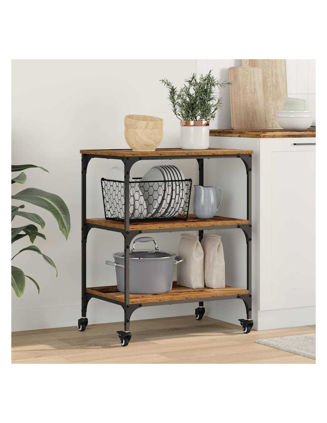 - Posizionamento consigliato: Perfetto per cucine e sale da pranzo, questo carrello si integra bene in spazi moderni dove serve spazio extra. Lo stile industriale si fonde perfettamente in loft urbani o cucine rustiche, portando un tocco di modernità.