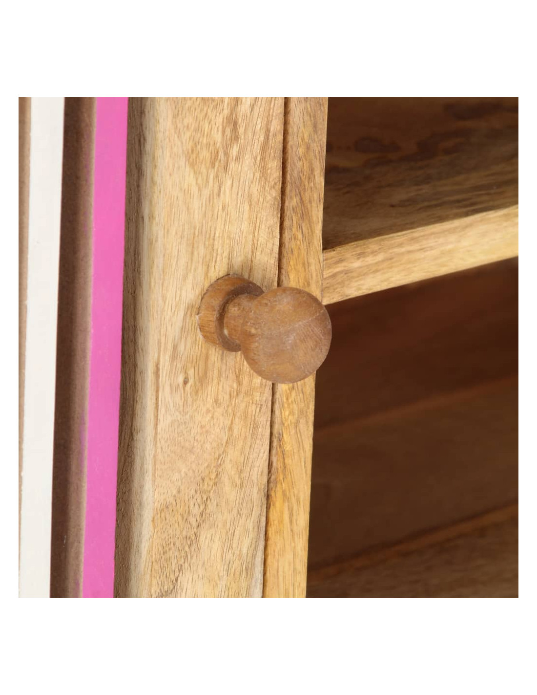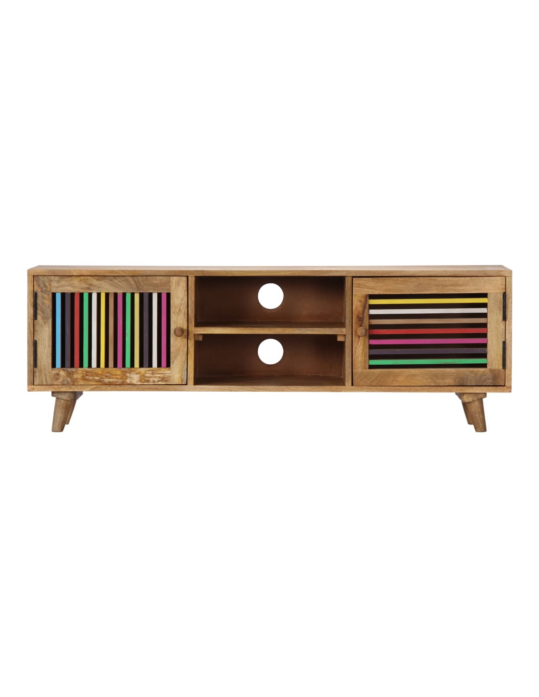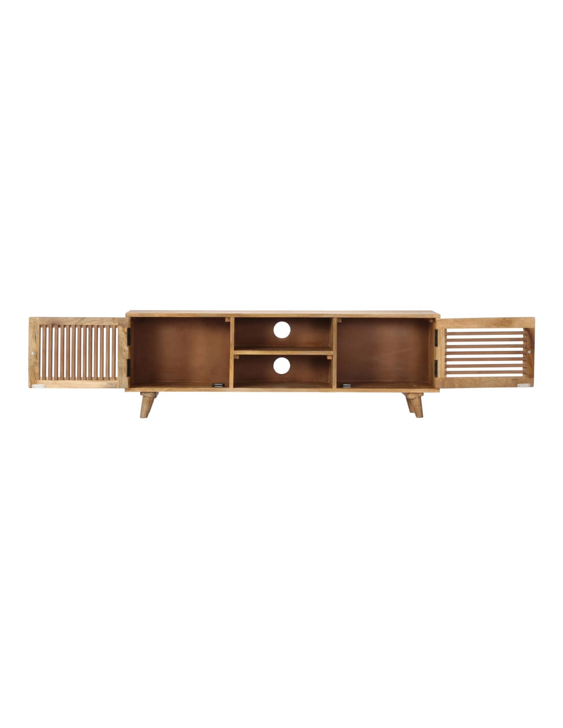 Questo mobile è realizzato in legno massello di mango, un legno duro con dense venature. Il mango grezzo non solo ha la forza di sopportare grossi pesi, ma resiste anche all'usura del tempo. Questo mobiletto dal design unico è stabile, resistente e accattivante. Inoltre, questo mobile stereo è completamente realizzato a mano e le venature del legno esteticamente accattivanti rendono ogni mobile distintivo e leggermente diverso dagli altri. Questa credenza è dotata di 2 scomparti, 1 scomparto e 2 armadietti con ante, offrendo ampio spazio per riporre dispositivi multimediali, libri e vari altri oggetti.