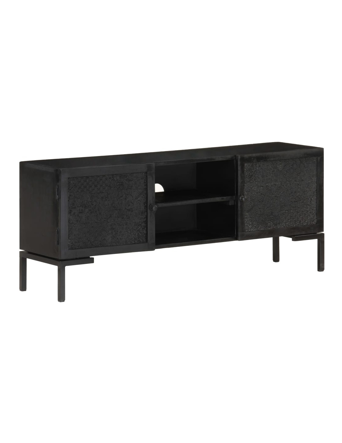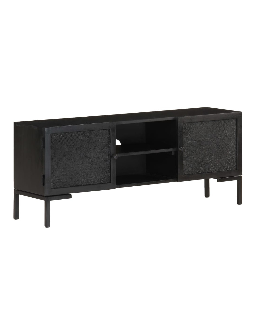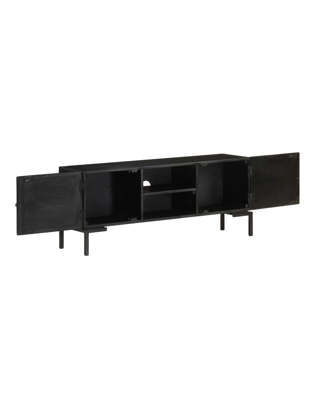 Il mobiletto per sistemi audio è realizzato in legno massello di mango, un legno duro tropicale in grado di sopportare pesi elevati e di resistere al meglio all'usura del tempo. È anche un materiale che rende il prodotto robusto e durevole. Il telaio in acciaio fornisce ulteriore solidità. Il mobile per sistemi multimediali dispone anche di due mensole e due ante che offrono ampio spazio per riporre dispositivi di streaming, libri e oggetti vari.