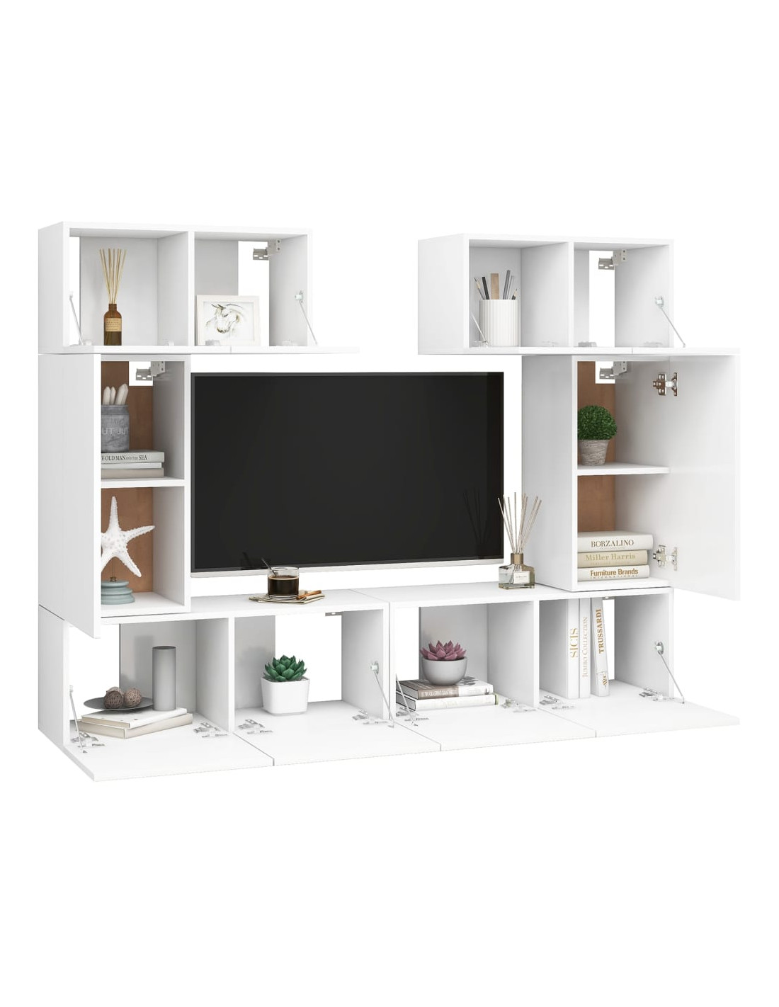 Il supporto TV si fissa al muro, ciò lo rende un'aggiunta senza tempo alla vostra casa. Questo set di armadietti HiFi è ideale per esporre e conservare tutti gli oggetti che desiderate, tenendoli ben organizzati e a portata di mano. Inoltre, il set è facile da pulire con un panno umido.