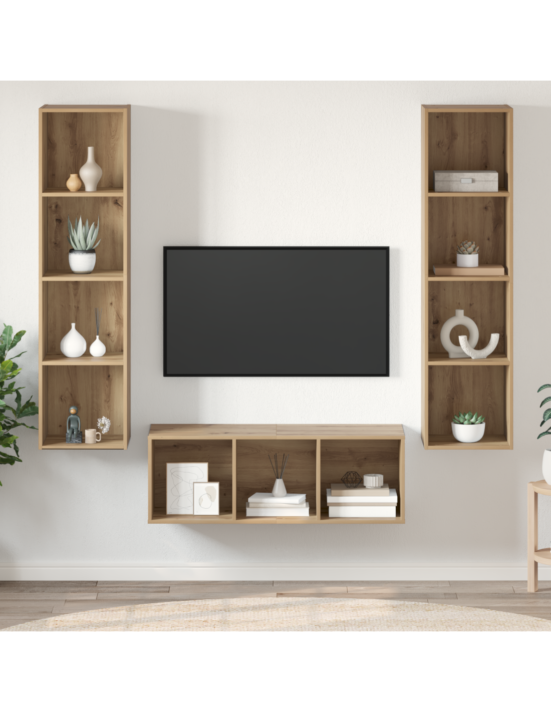 - Ripiani di archiviazione: Con pratici ripiani in legno, questo set offre tanto spazio per riporre. I ripiani possono ospitare una varietà di oggetti, dai dispositivi multimediali ai pezzi decorativi, semplificando l'organizzazione e l'accessibilità.